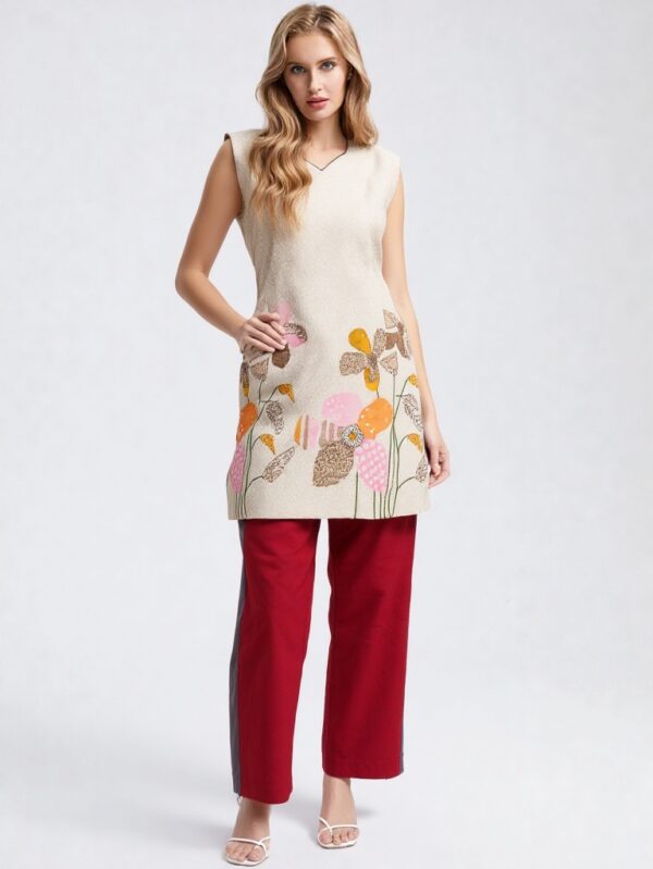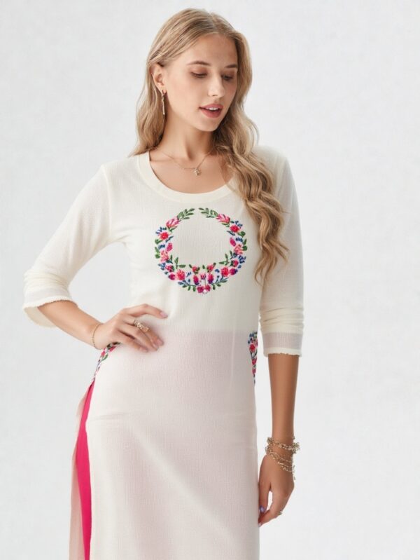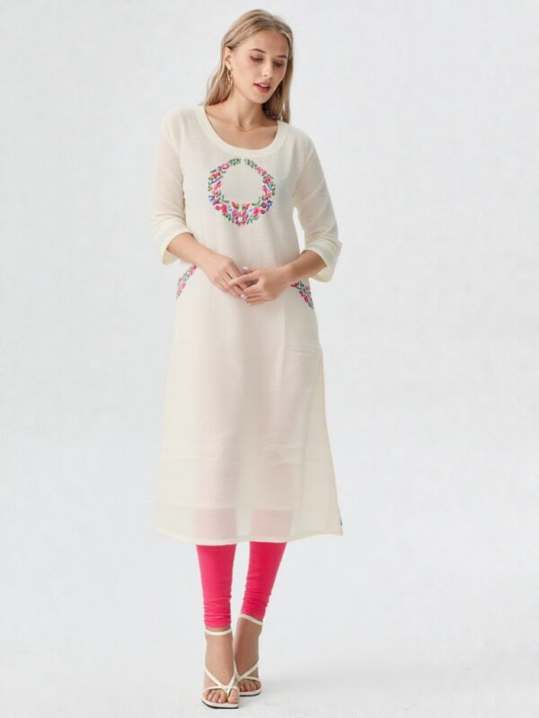 - Elegant off-white base with colorful floral embroidery