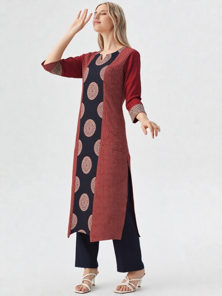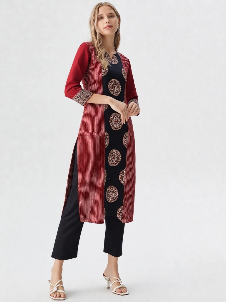 Rooted in tradition and reimagined for the modern woman, this kurti from Aabnadha Arts reflects timeless craftsmanship and effortless grace. The rich maroon tones beautifully frame a striking black panel, adorned with intricate ethnic motifs that echo heritage artistry.