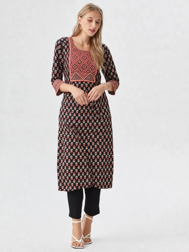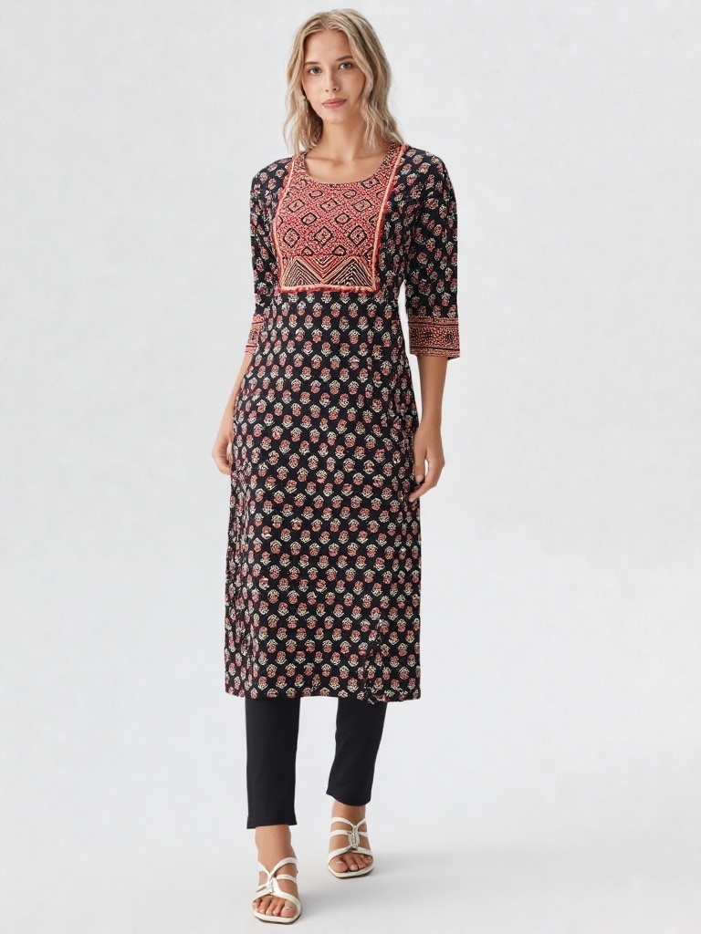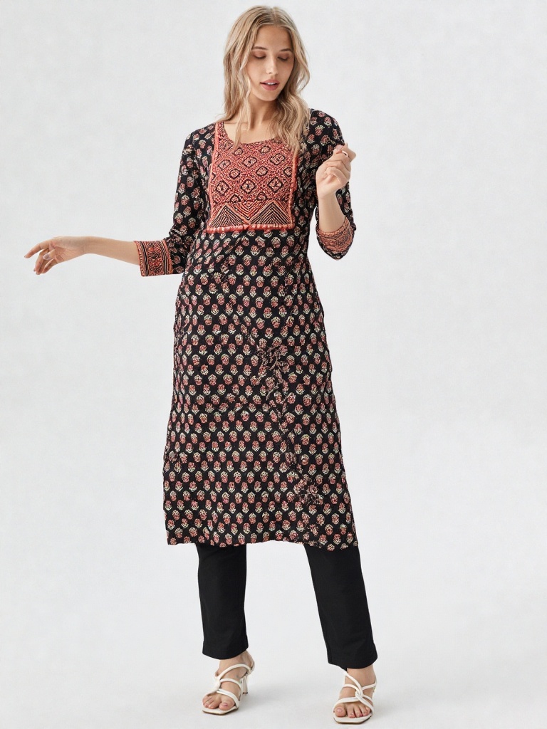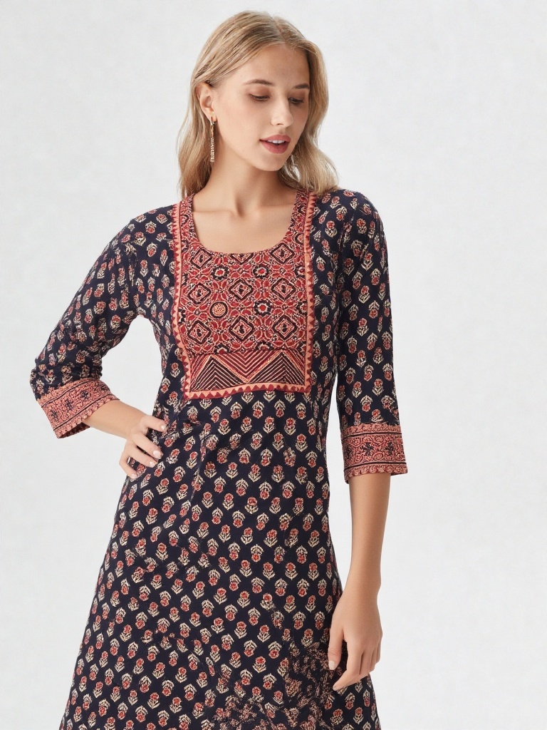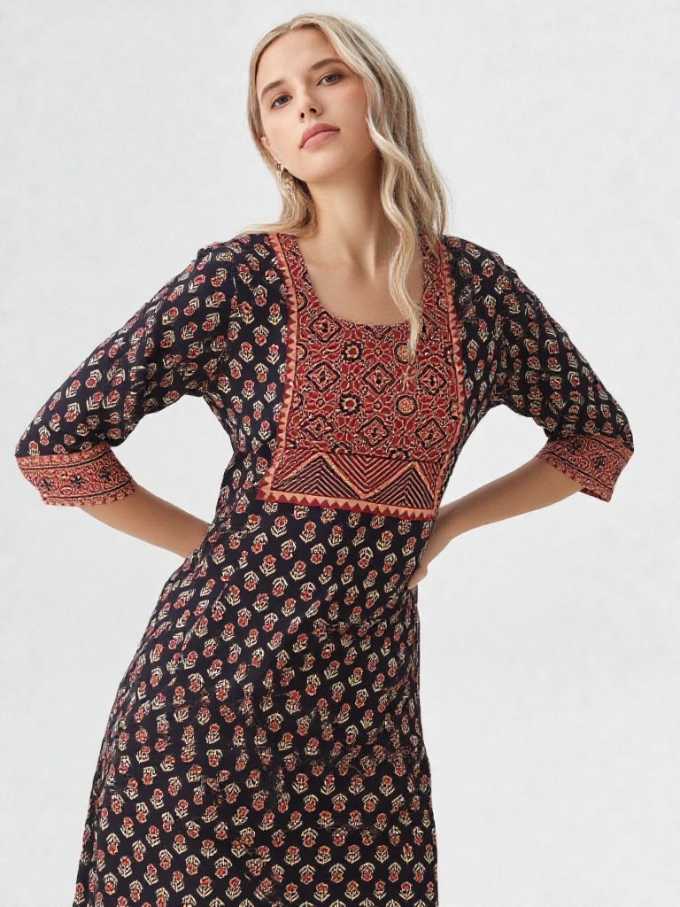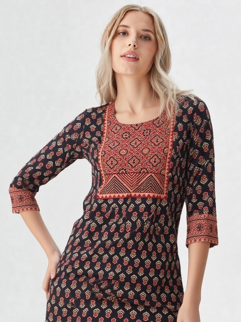 Crafted in timeless Ajrakh-inspired prints, this kurti features a deep black base adorned with delicate floral motifs, complemented by a striking geometric yoke in earthy rust tones. The intricate panel detailing adds depth and highlights the beauty of traditional craftsmanship.