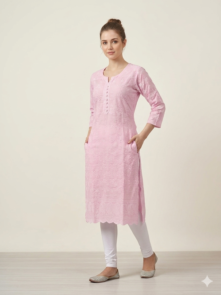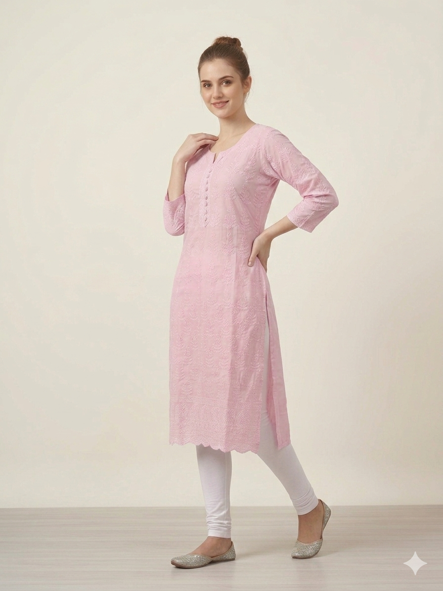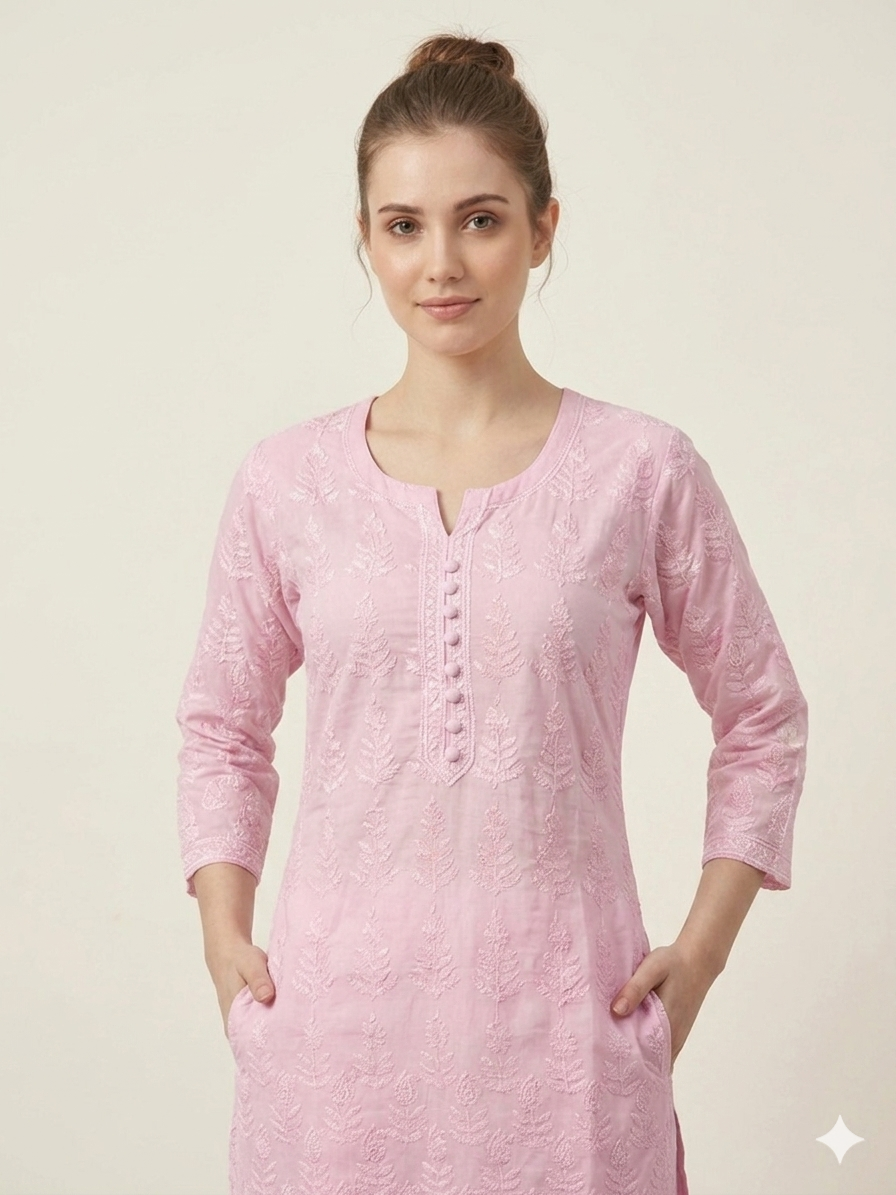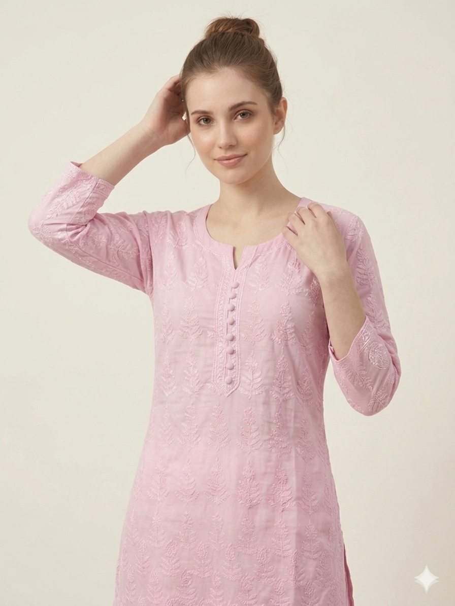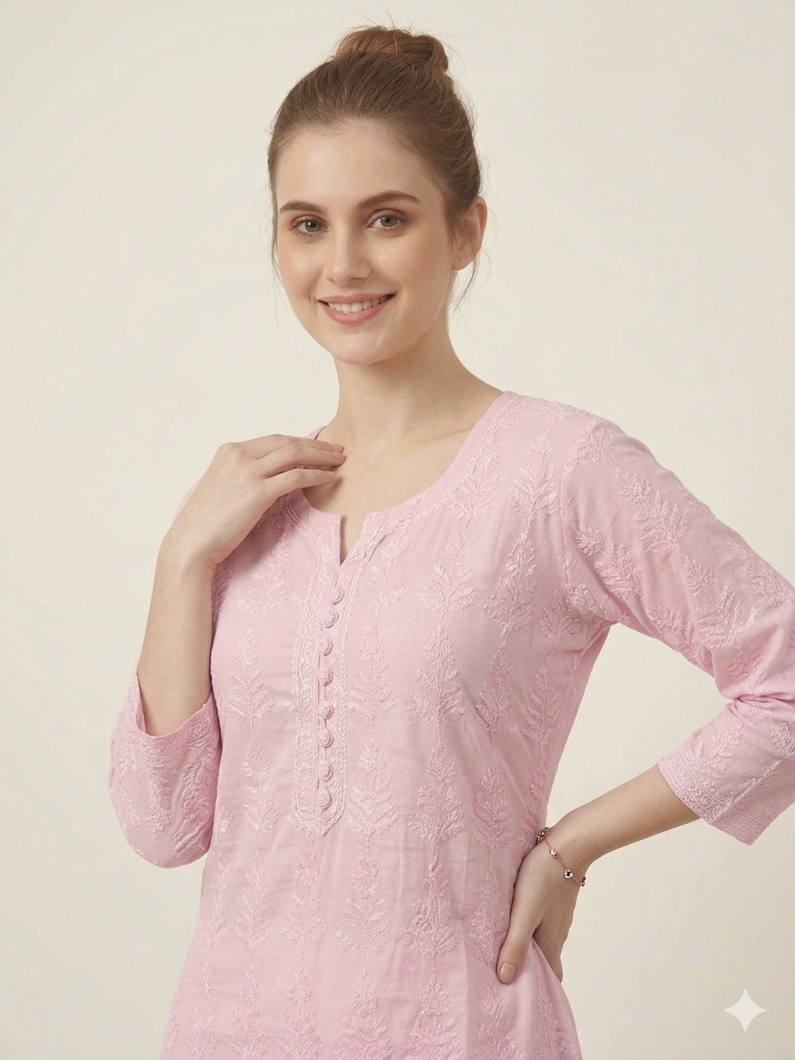 Graceful, feminine, and effortlessly elegant — this blush pink kurti is a beautiful expression of everyday charm. Crafted in soft, breathable fabric, it features delicate all-over embroidery that adds subtle texture and timeless appeal.