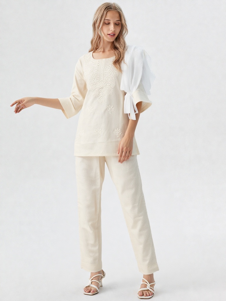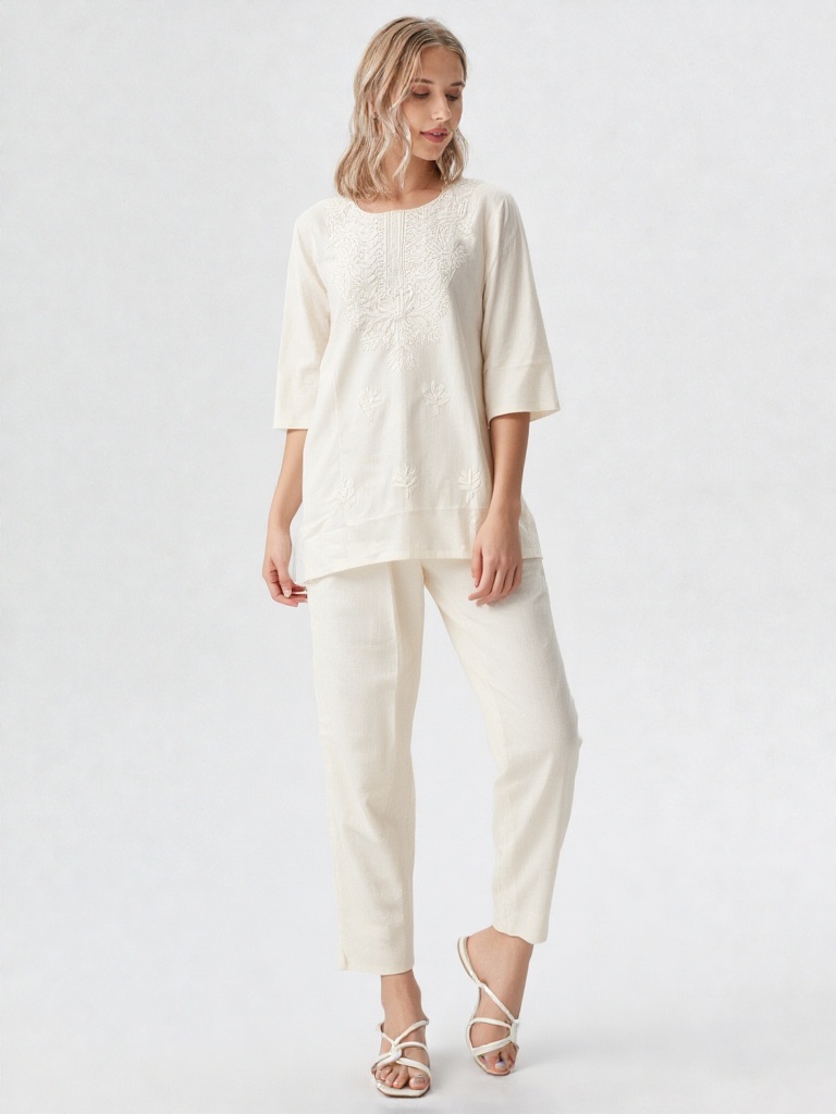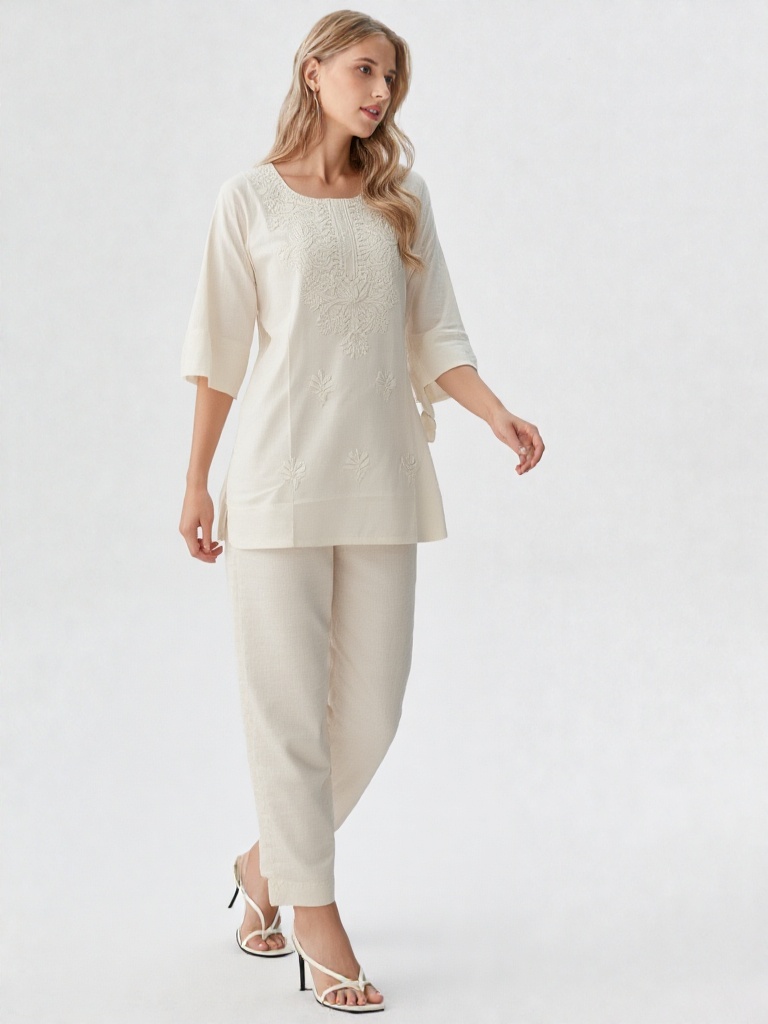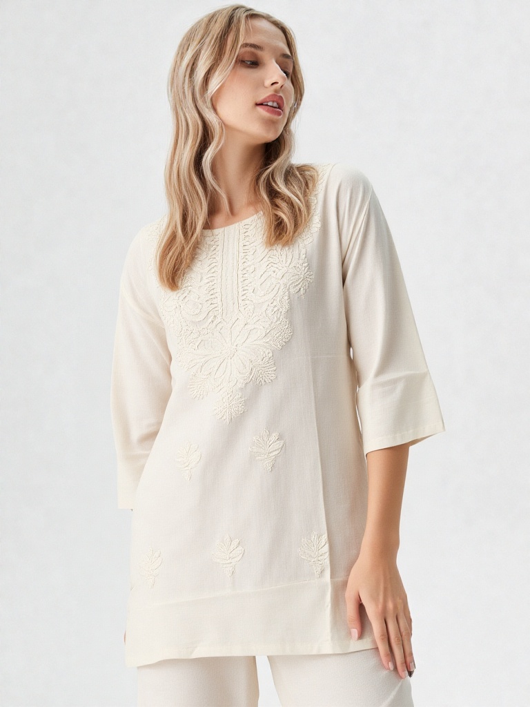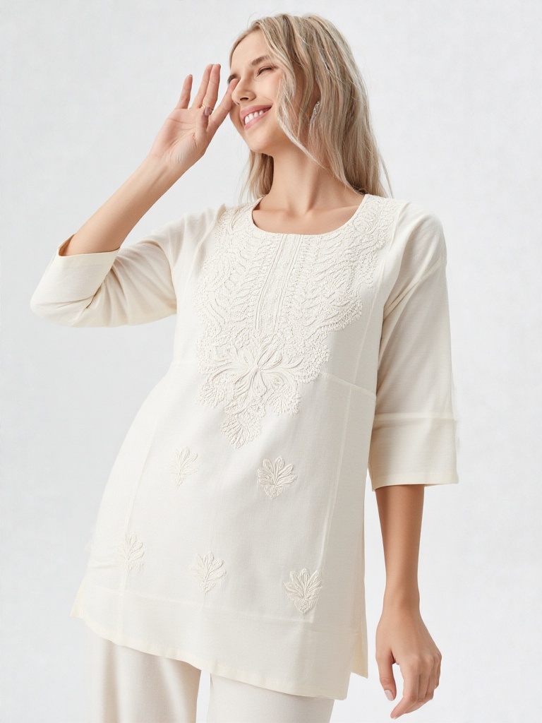 The subtle off-white tone is enhanced with delicate tonal embroidery on the front, adding texture and depth without overpowering the look. Designed with a clean round neckline and relaxed 3/4th sleeves, this tunic brings together simplicity and sophistication in perfect balance.
