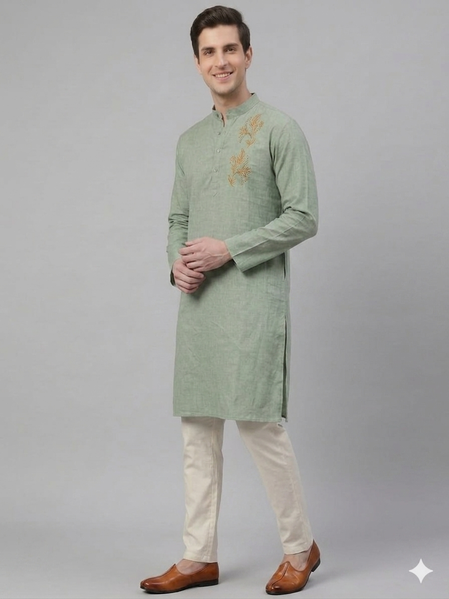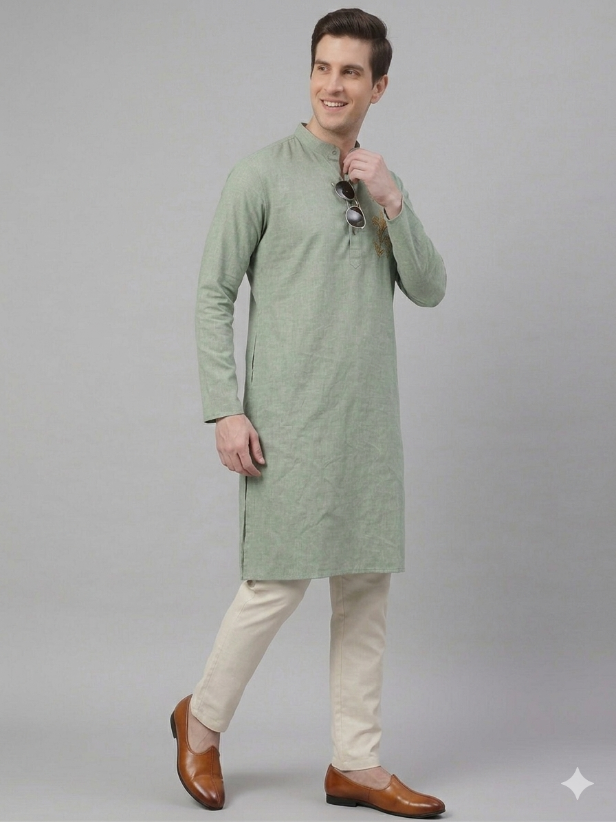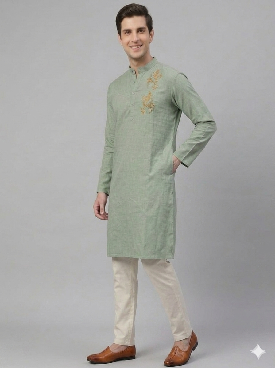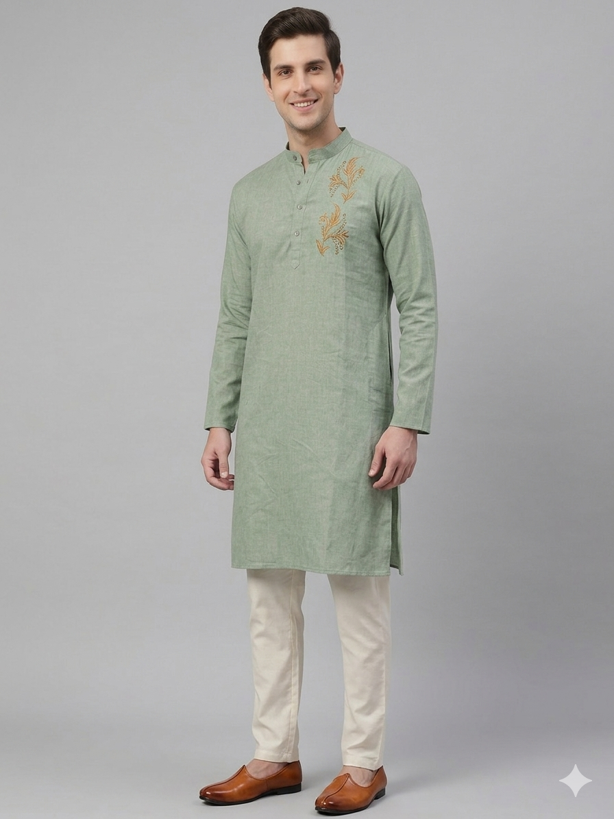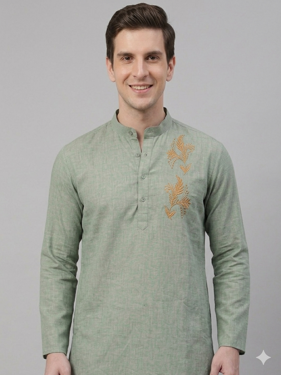 Redefine your ethnic silhouette with the Flora Kurta. This piece is a masterclass in “Quiet Luxury,” blending a muted, earthen sage palette with high-contrast gold artisanal embroidery. Designed for the modern man who values precision, the kurta features a structured Bandh-style collar that commands presence while maintaining a relaxed, breathable feel.
