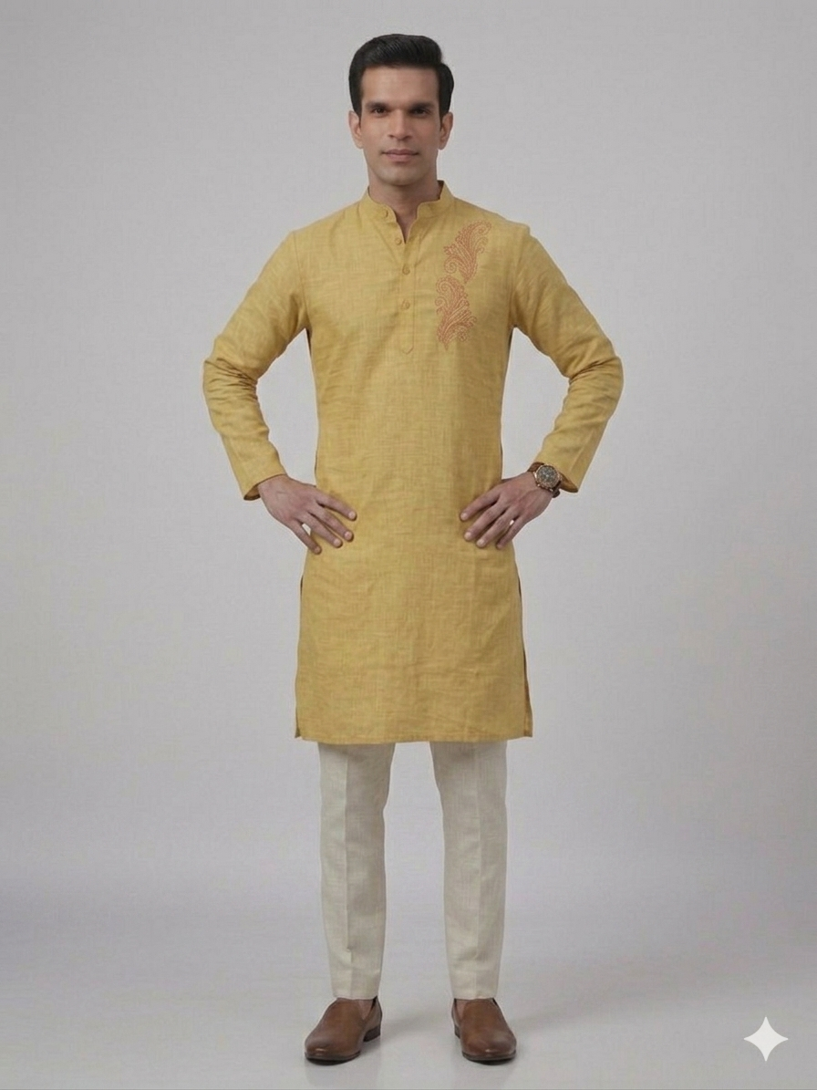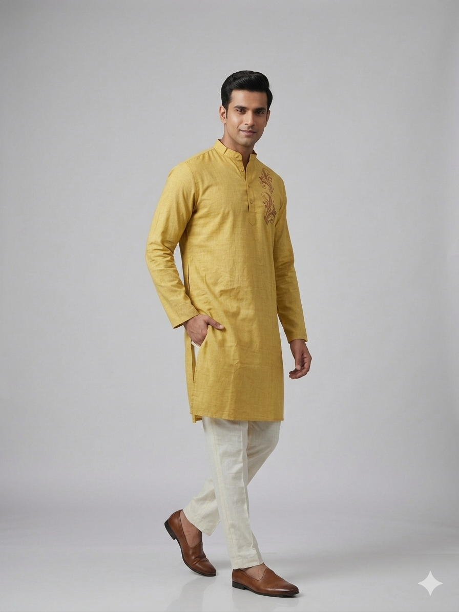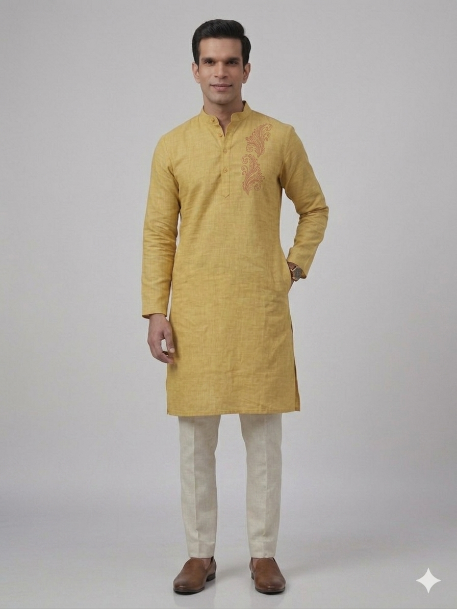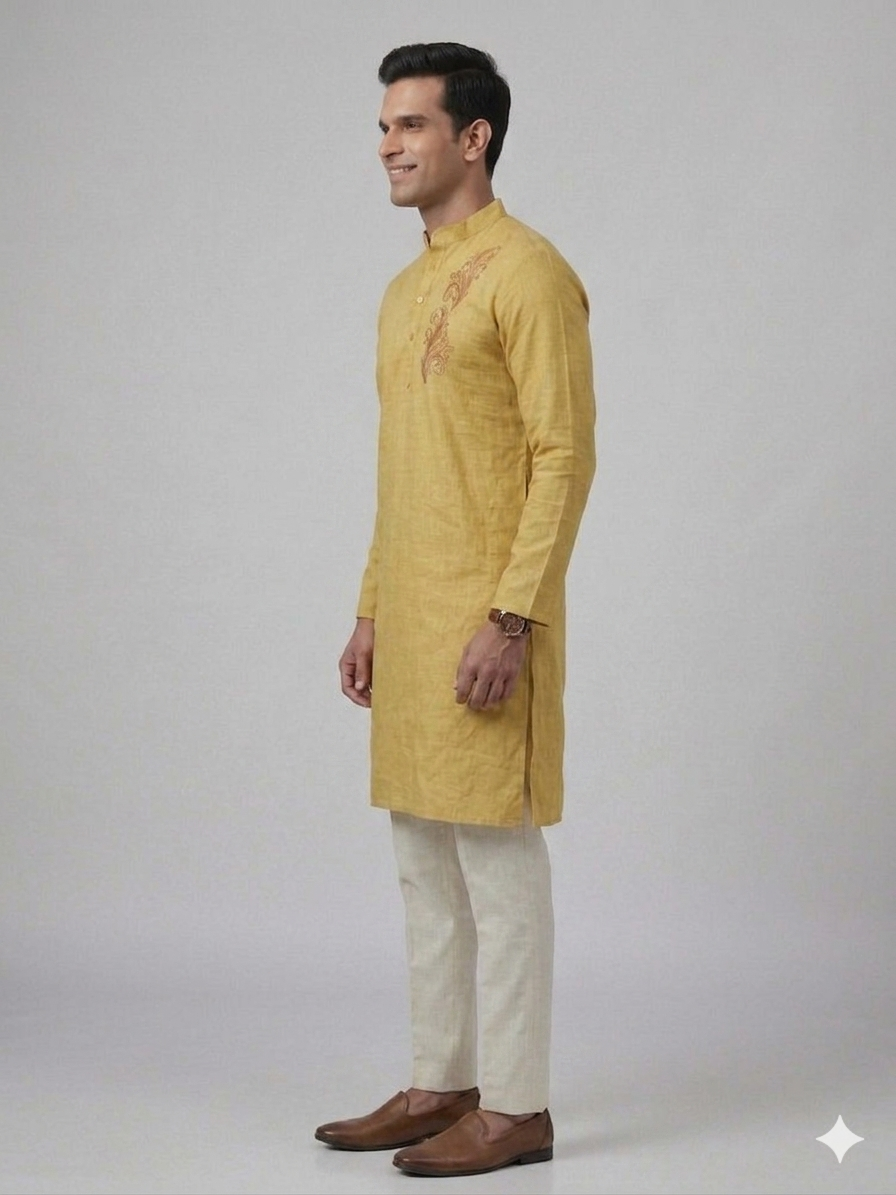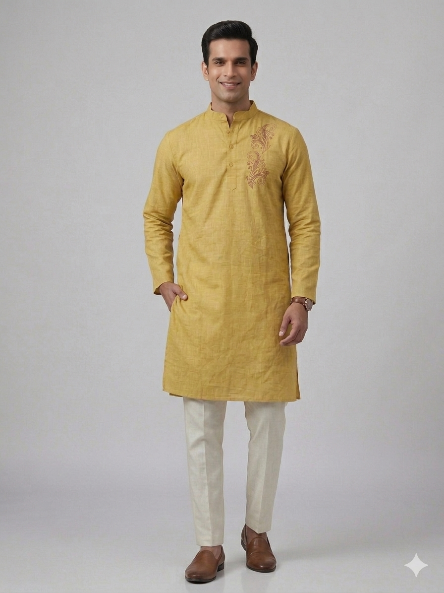 Elevate your ethnic wardrobe with the Gents Kurta – Flora (Yellow), crafted in Aabandh’s signature style. Designed in a rich mustard yellow shade, this kurta features elegant floral embroidery on the chest, adding a refined touch to its timeless appeal. Tailored from premium-quality fabric, it offers exceptional comfort, breathability, and a flattering fit. The classic mandarin collar and full sleeves enhance its sophisticated silhouette, making it an excellent choice for festive celebrations, weddings, cultural gatherings, and special occasions.
