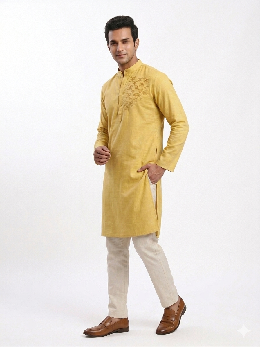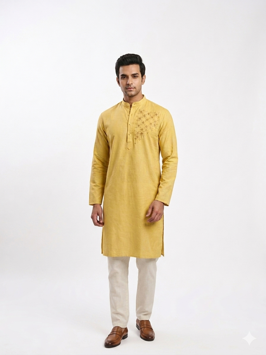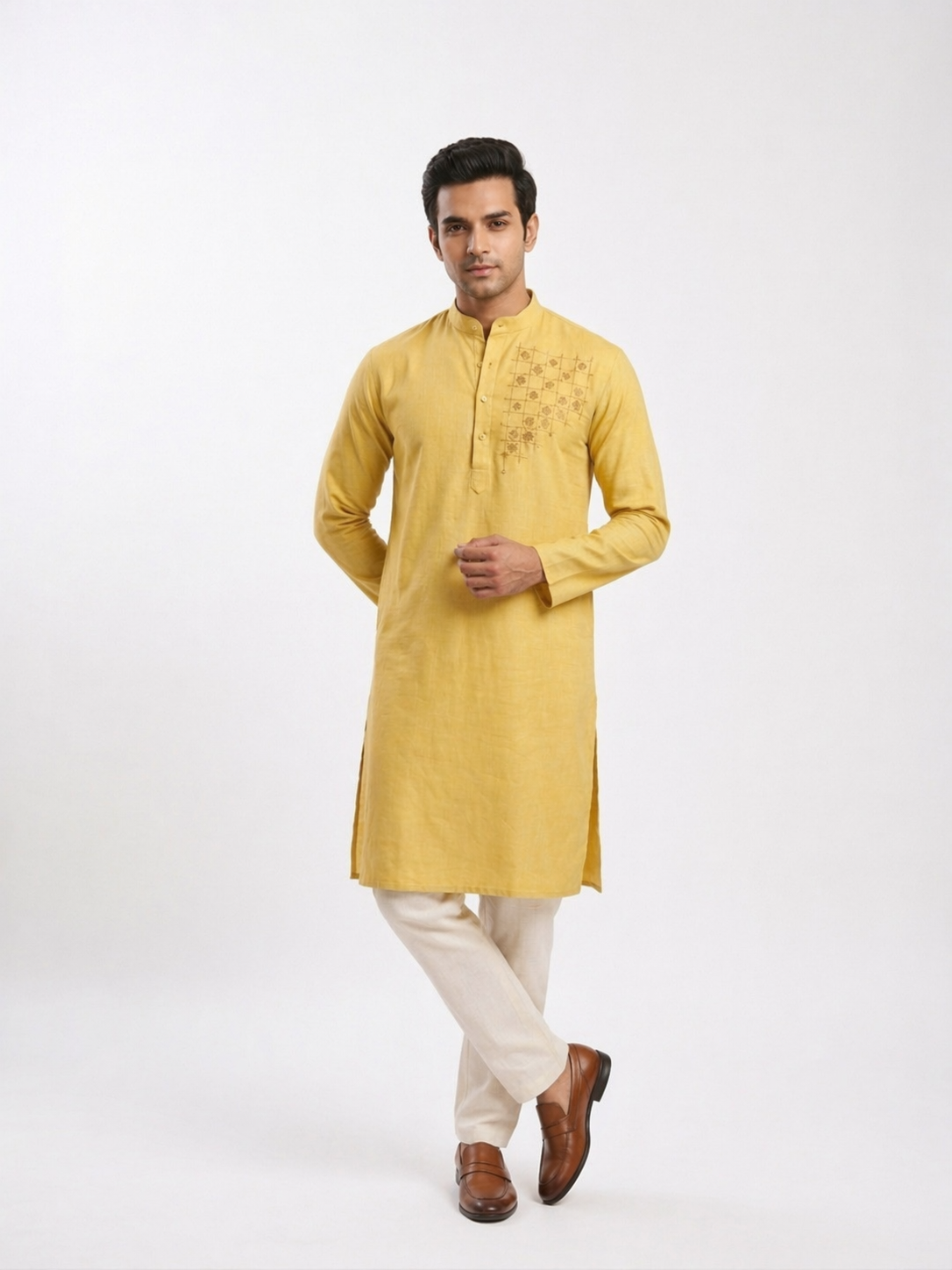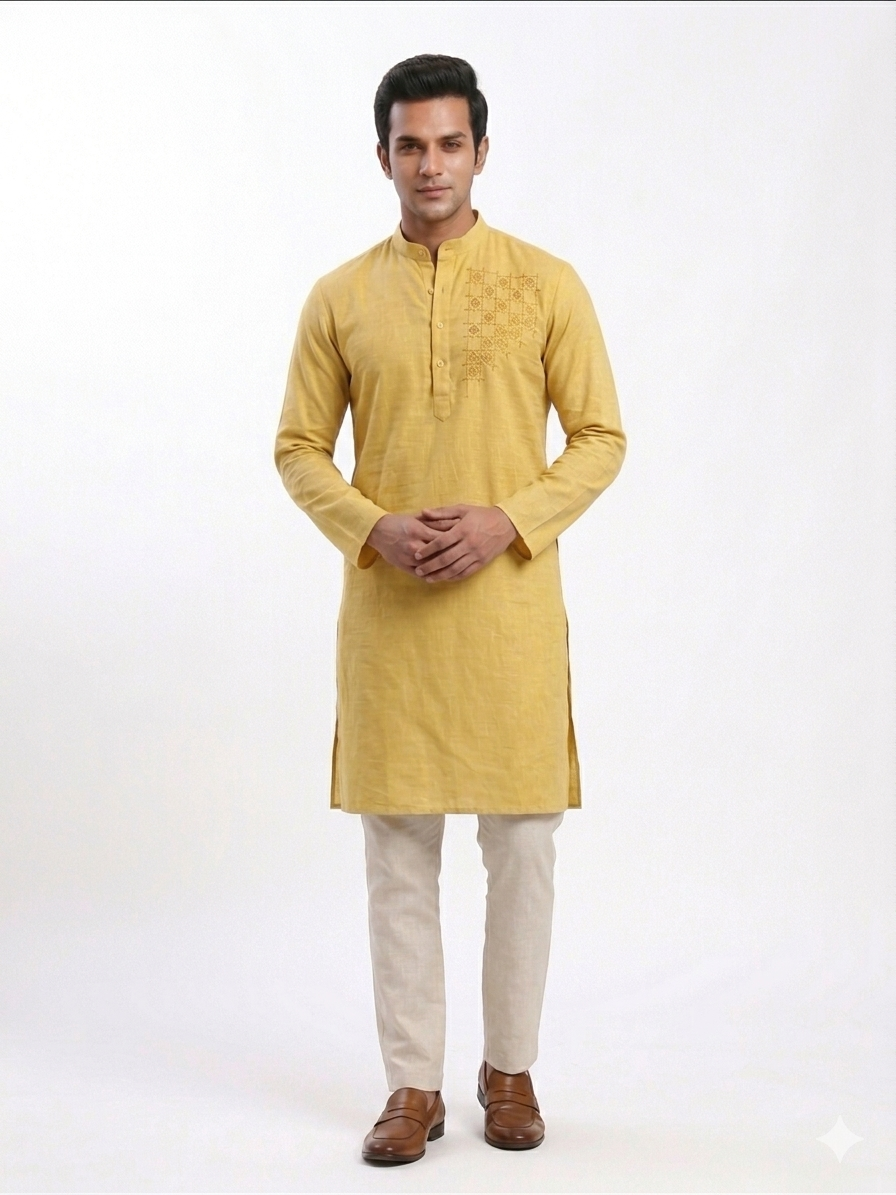 Add a touch of refined simplicity to your ethnic collection with this grid yellow kurta, designed in a classic Aabandh style. Featuring a soft yellow tone and a neatly crafted embroidered grid pattern on the chest, this kurta offers a perfect balance of minimalism and detail. The straight-cut silhouette and clean finish create a sharp, modern look, while the lightweight fabric ensures comfort throughout the day. Ideal for festive occasions, casual gatherings, or daytime events, this kurta pairs effortlessly with light-colored bottoms for a polished appearance.