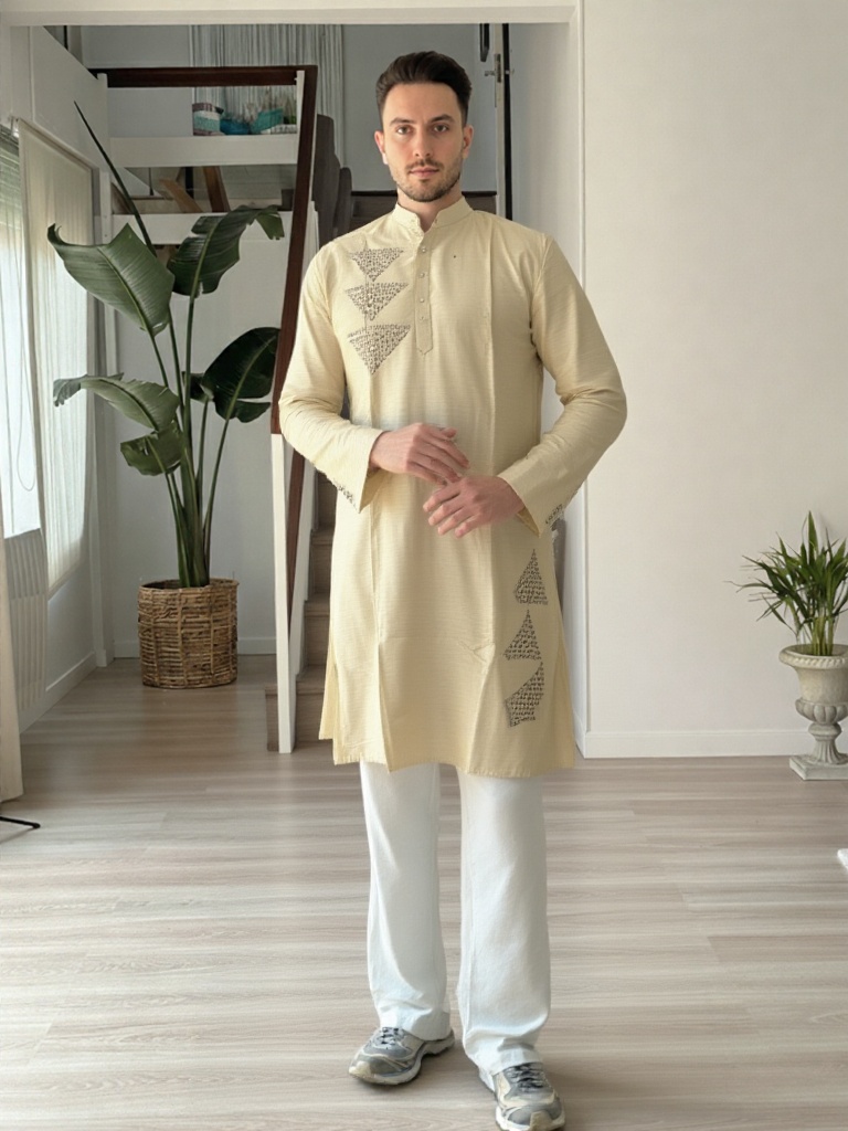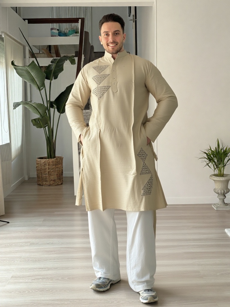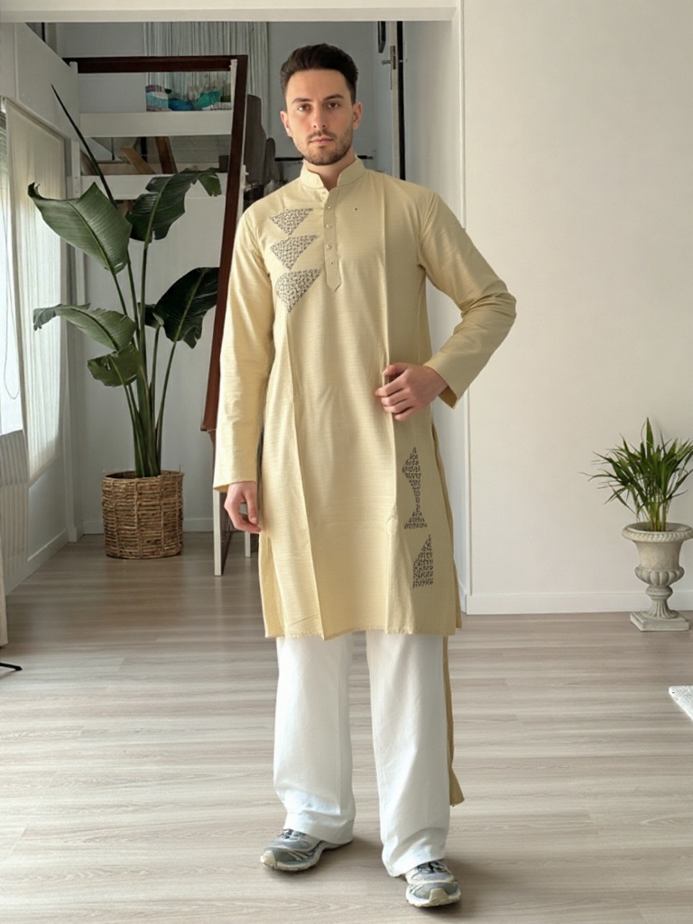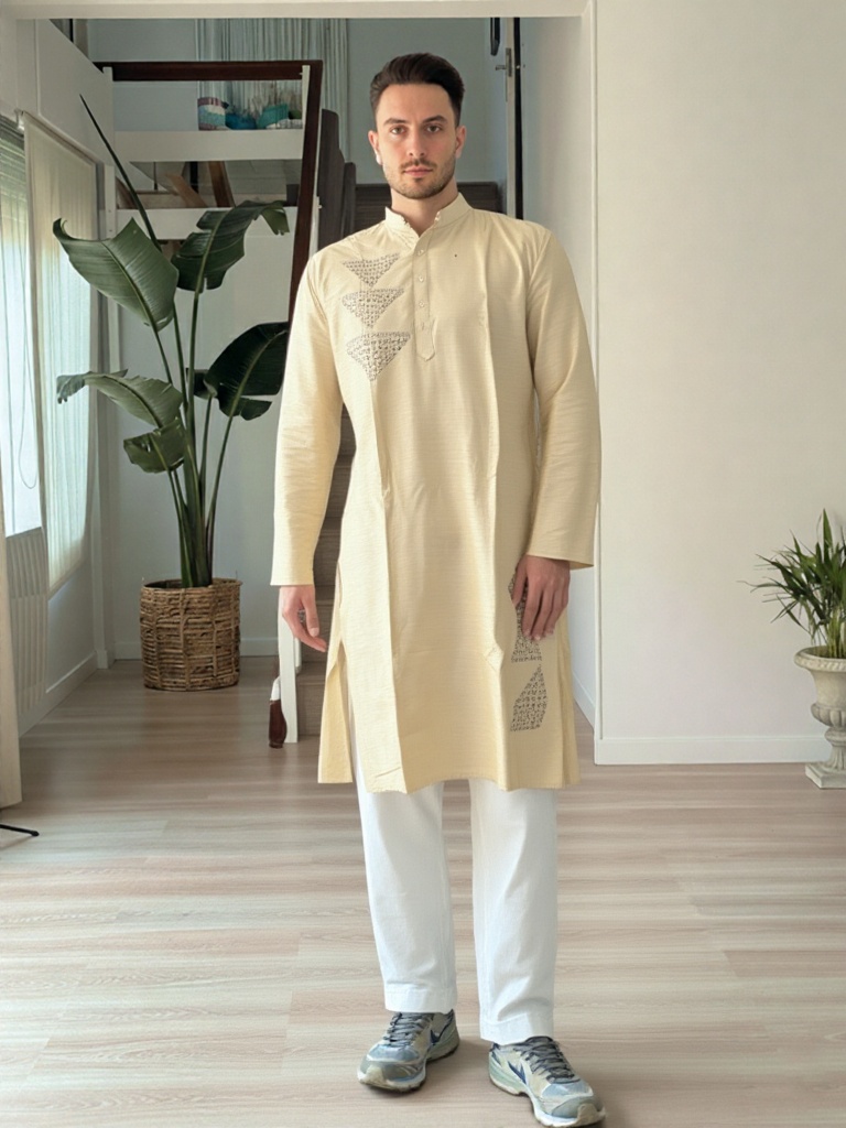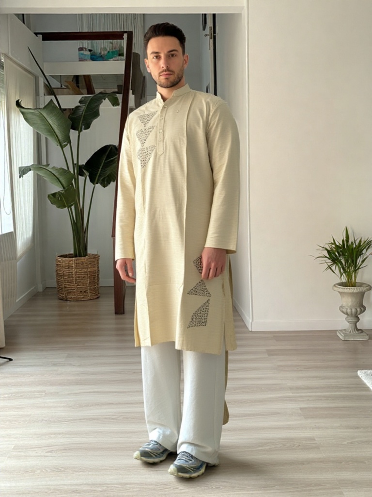Clean, contemporary, and rooted in tradition, this Aabandh-style kurta is designed in a soothing off-white tone for a refined, understated look. Featuring distinctive pyramid-inspired detailing across the front and side panel, the design adds a unique geometric character while maintaining a minimal aesthetic.