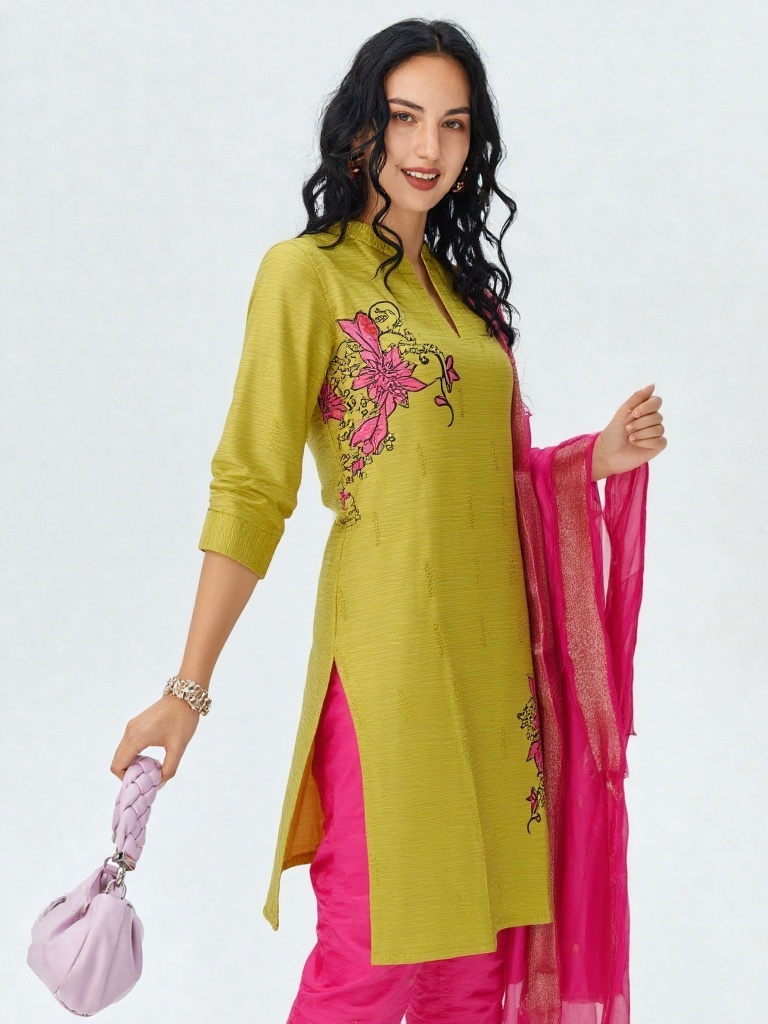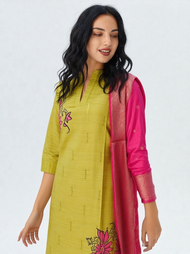 The kurti features handcrafted floral motif in vibrant pink and black, delicately placed to add a touch of sophistication. Its notched collar neckline and three-quarter sleeves reflect modern minimalism.