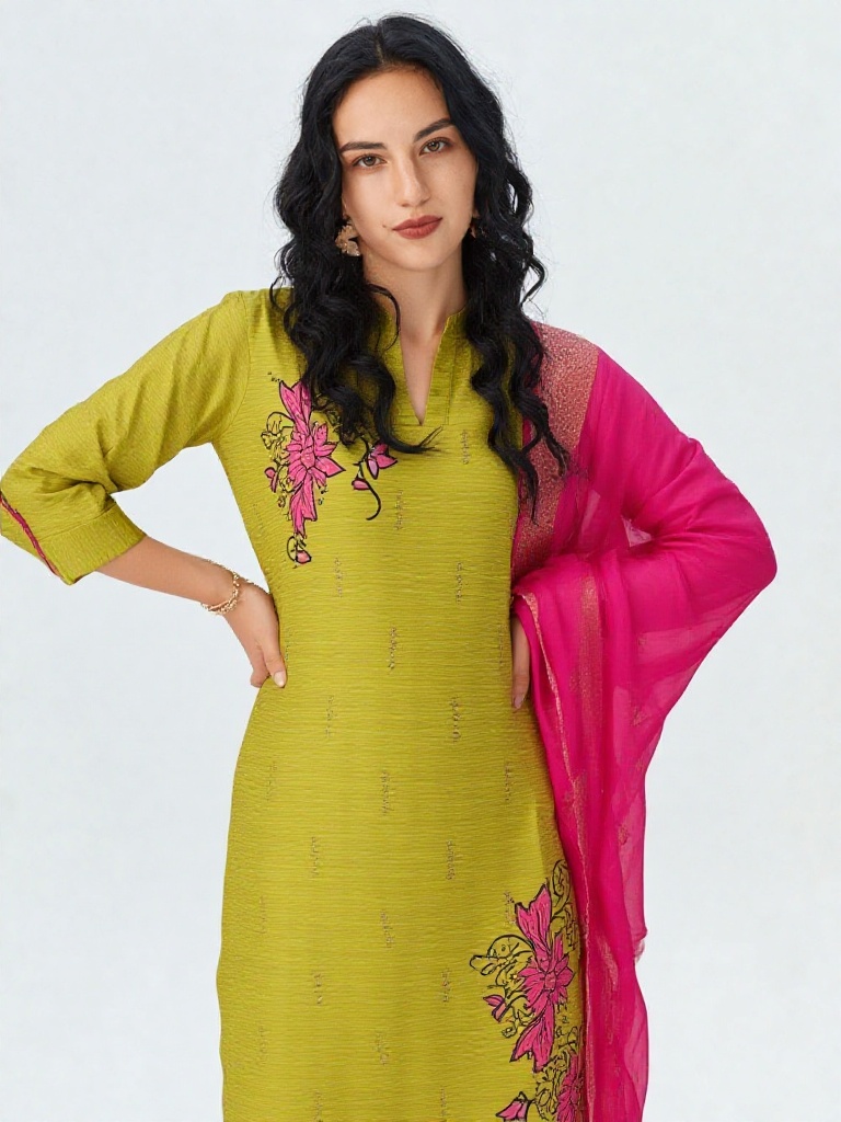 Step into timeless elegance with this exquisite Parrot Green Cotton Silk Kurti , a perfect blend of rich texture and artistic finesse. Crafted in premium cotton silk, the fabric carries a soft sheen and graceful fall that enhances every movement.