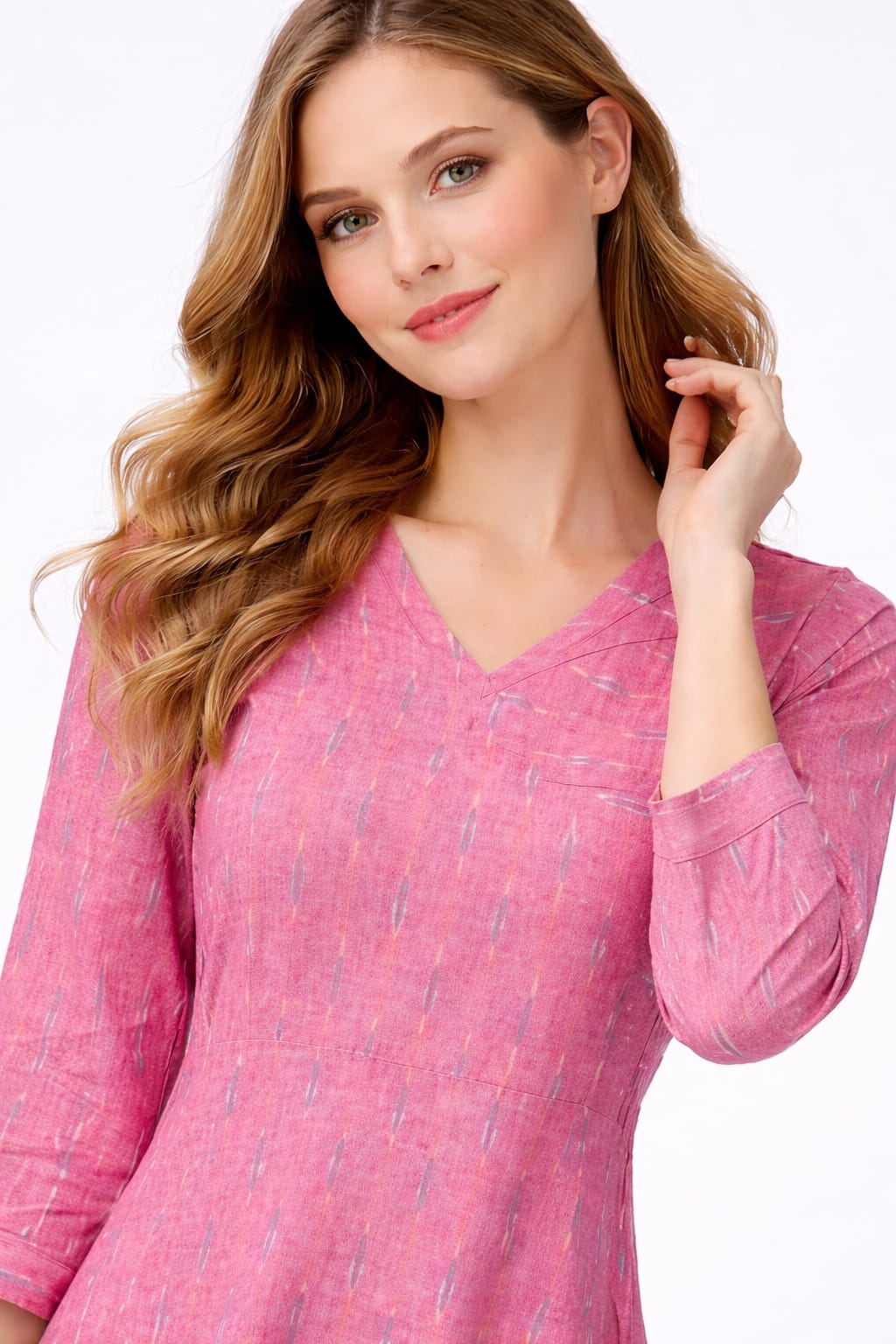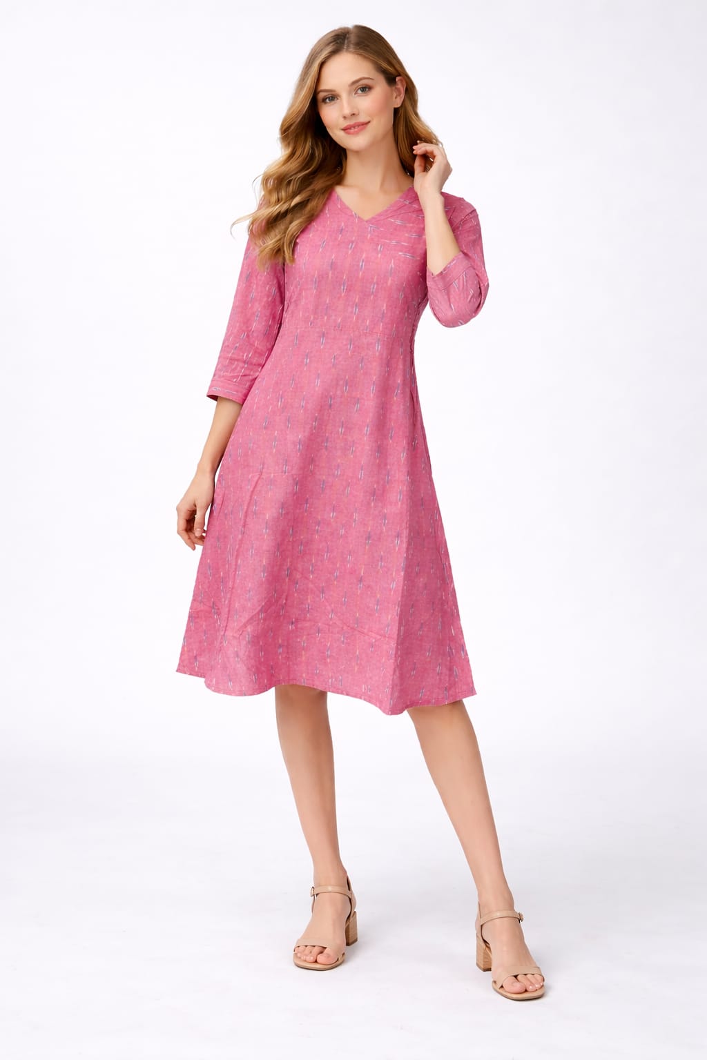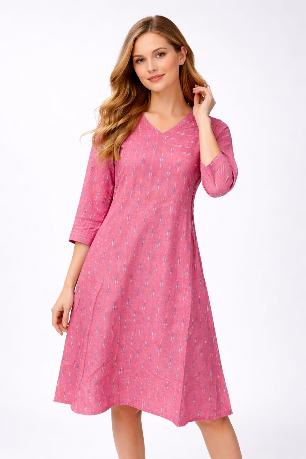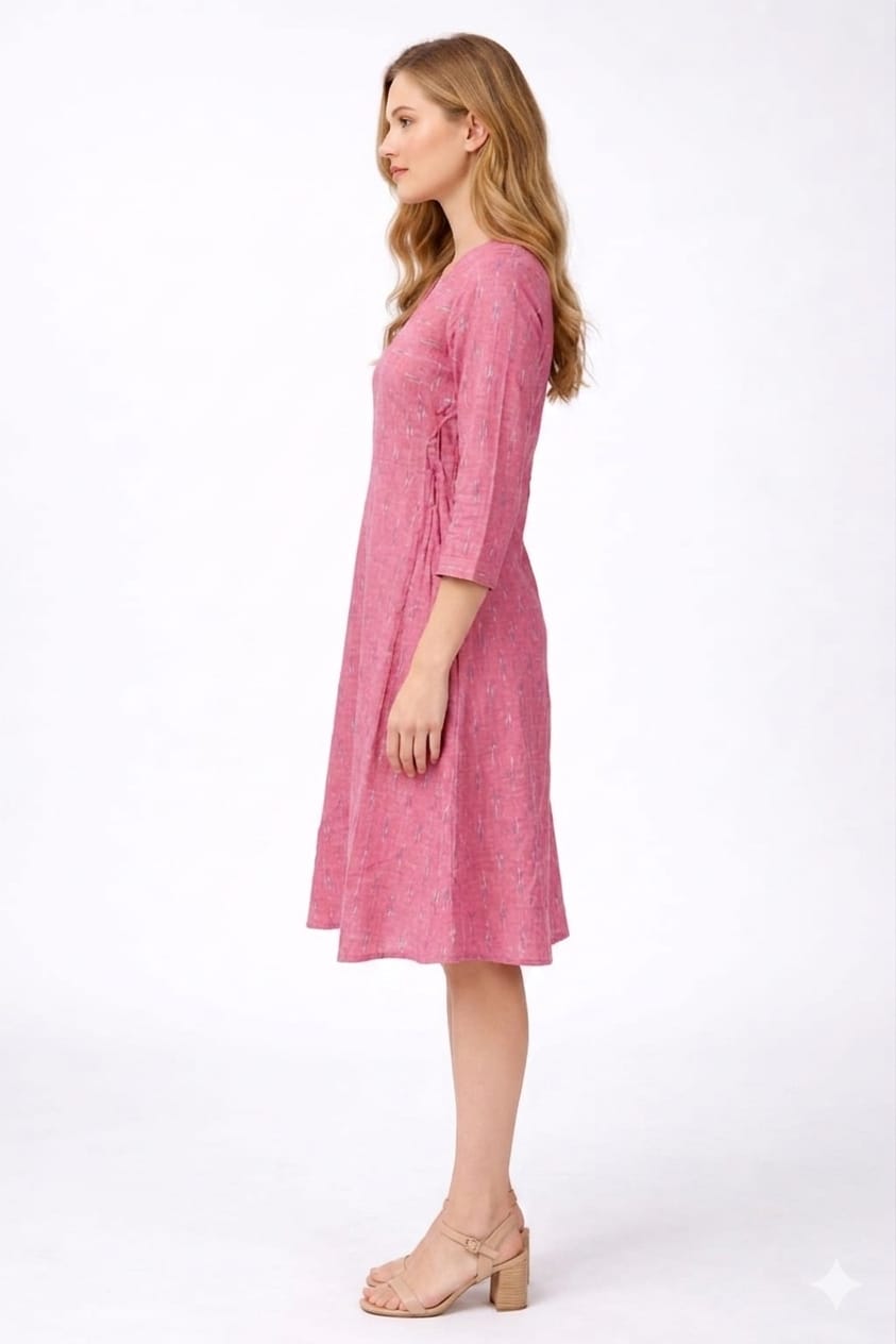 The soft pink base is elevated with subtle Ikkat-inspired motifs, giving it a refined handcrafted appeal without being overpowering. The V-neckline adds a touch of femininity, while the 3/4th sleeves keep the look balanced and versatile. Perfectly tailored for effortless movement, this dress is ideal for both casual outings and smart daywear styling.