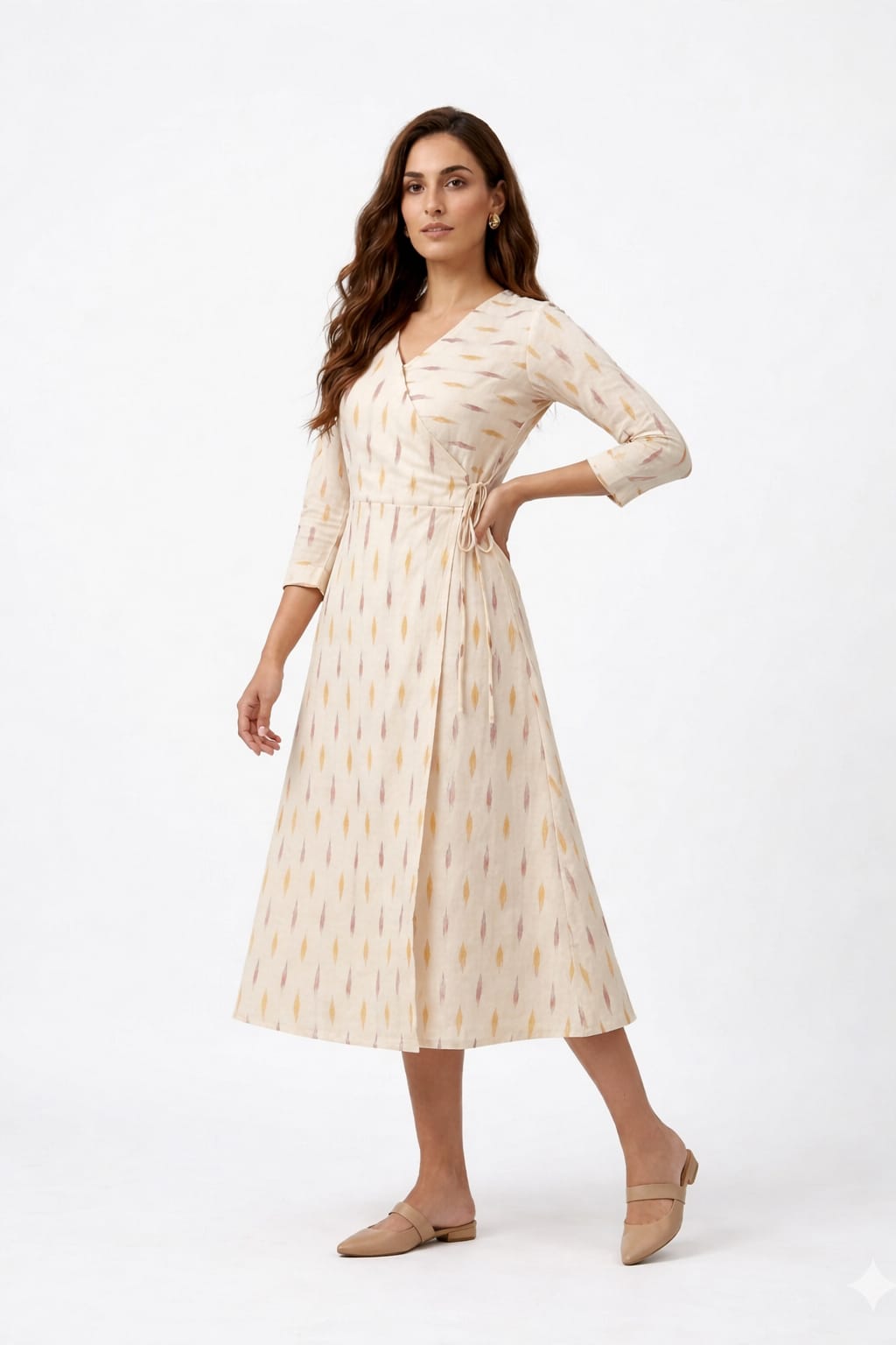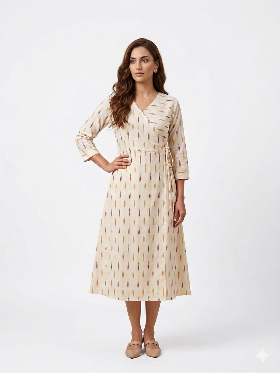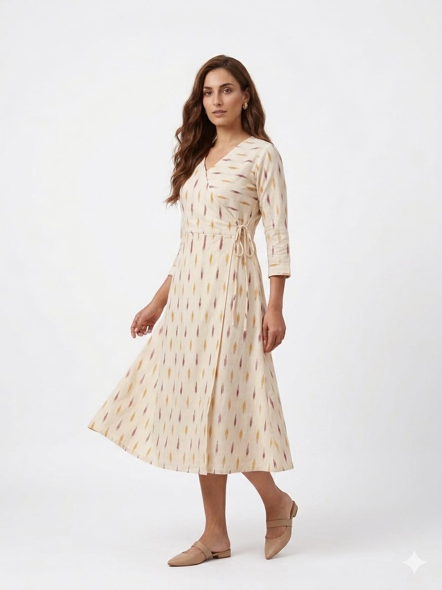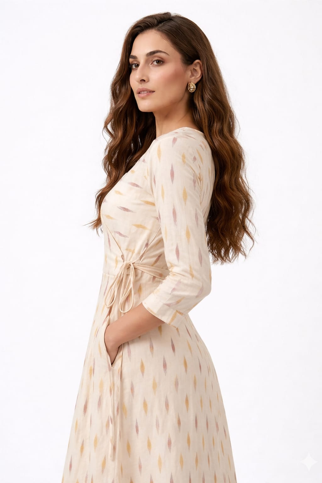 Featuring classic Ikkat-inspired prints in subtle earthy tones, the design reflects understated sophistication. The wrap-style bodice with a V-neckline adds a modern touch, while the adjustable side tie-up enhances the fit and defines the waist beautifully.