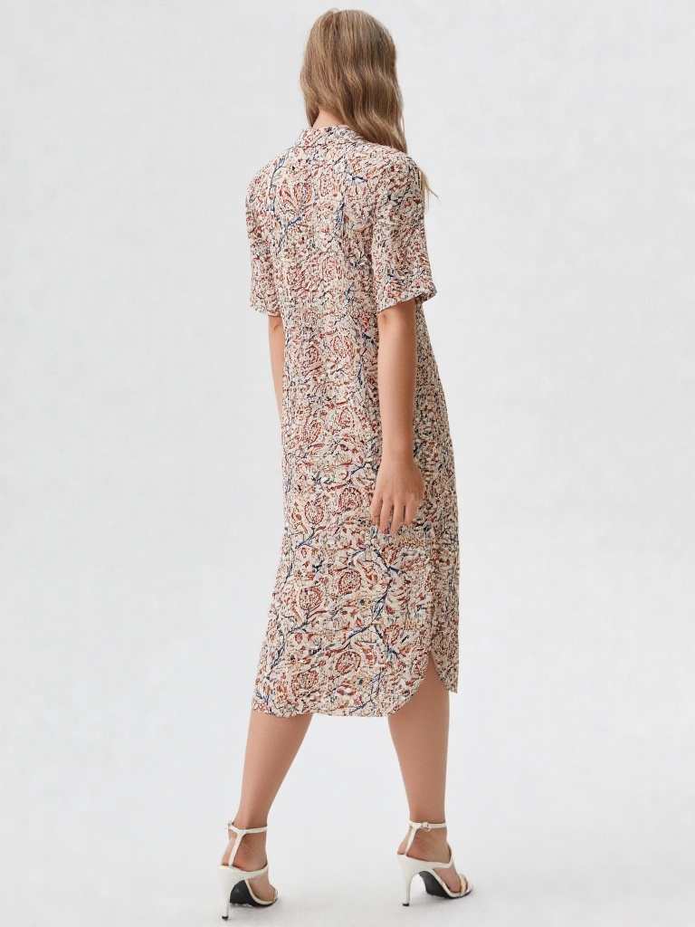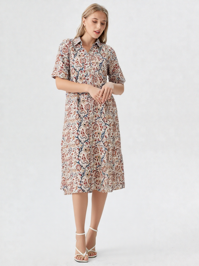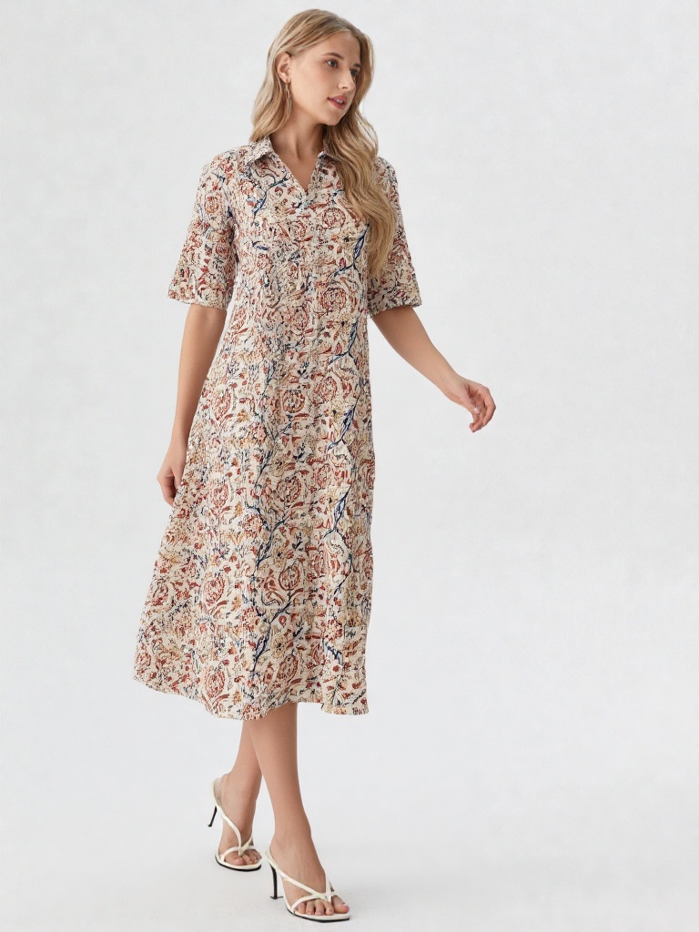 Set on a soothing white base, the Kalamkari-inspired print brings in fine detailing with a subtle, artisanal feel. The shirt collar and front button placket add a touch of structure, while the short sleeves keep the look light and practical.