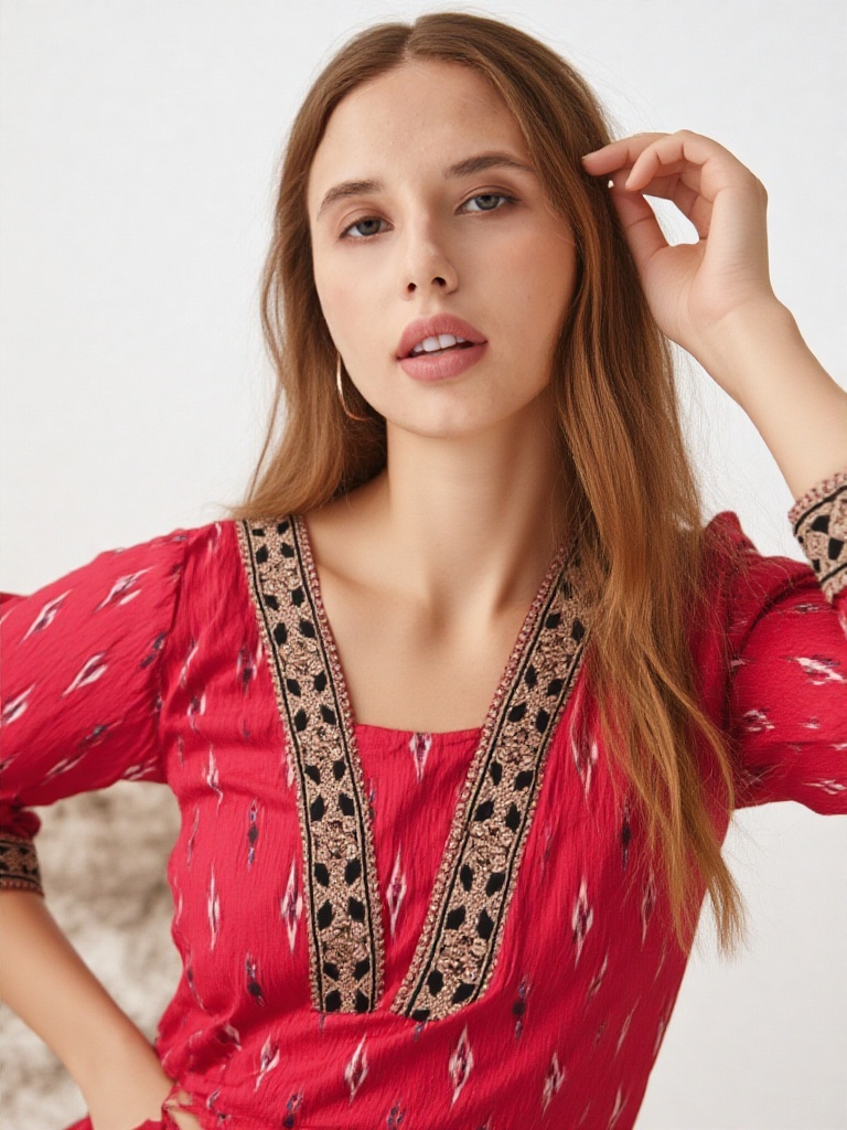 The kurti is highlighted with a contrast embroidered V-neckline and matching sleeve detailing, giving it a refined and graceful look. The layered design adds a modern twist to the classic silhouette, making it both stylish and comfortable for all-day wear.