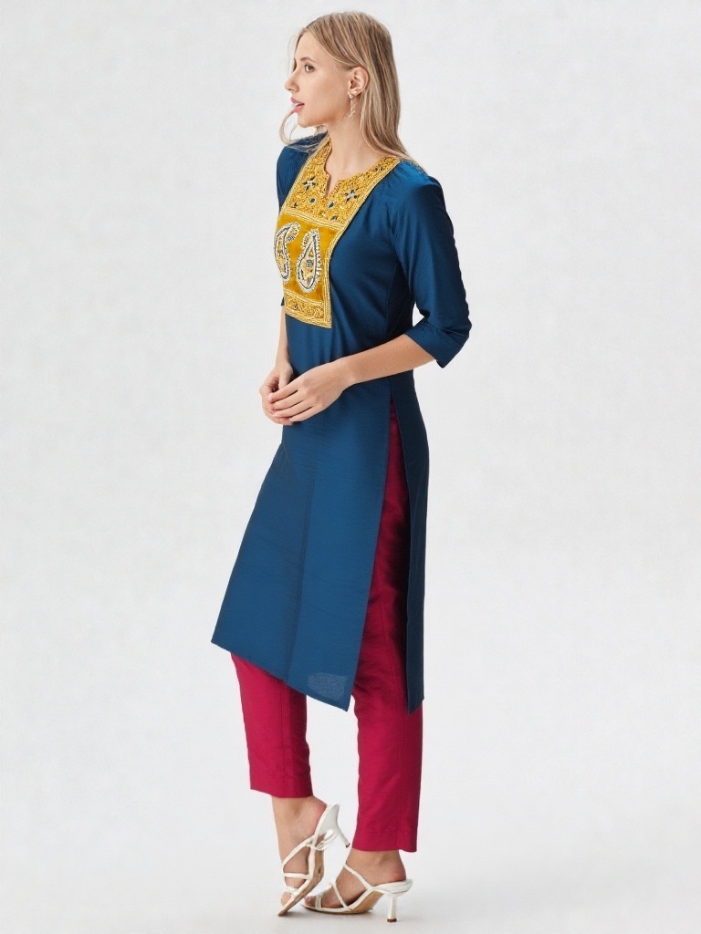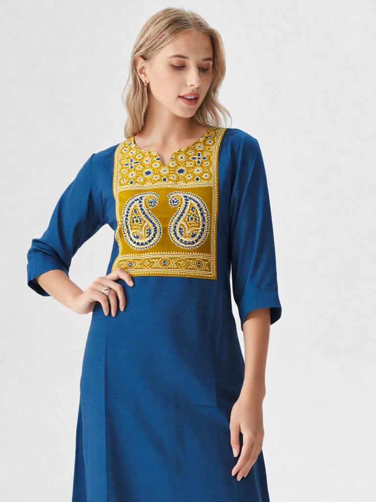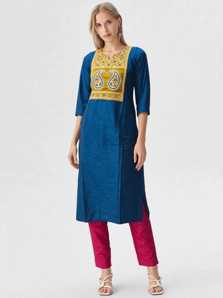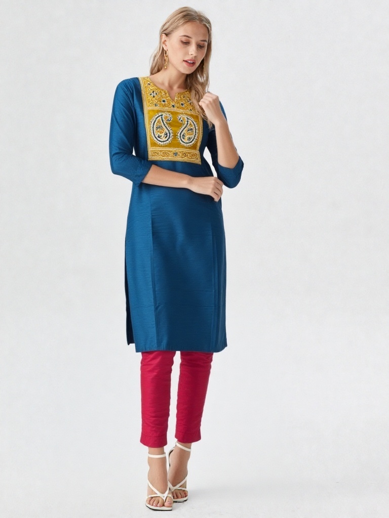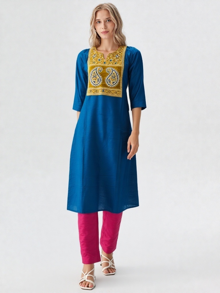 Step into effortless grace with this beautifully crafted Abhand-style kurti, designed to blend tradition with modern charm. Featuring a rich teal blue base, this kurti is highlighted by an intricately embroidered yoke in mustard and white tones, showcasing classic paisley motifs that reflect timeless artistry.