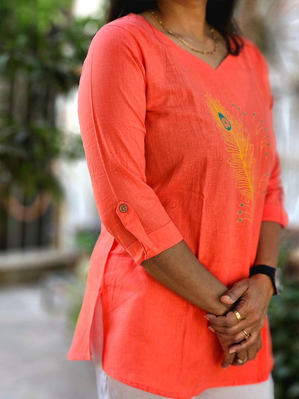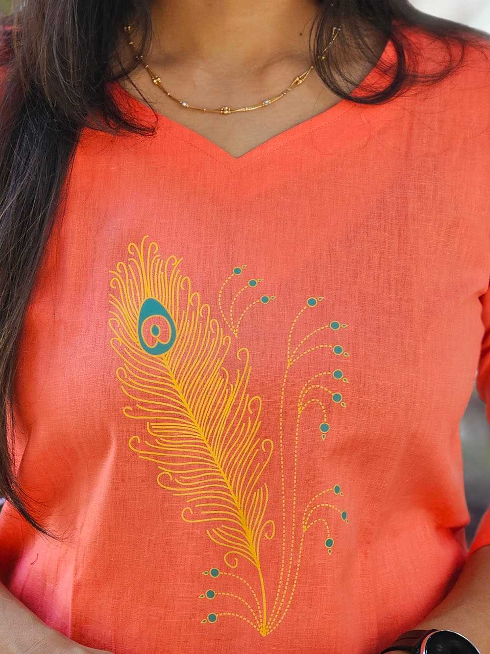 Crafted from soft, breathable cotton, this Aabandh Tunic celebrates comfort with elegance. The design, inspired by the delicate beauty of the Mayurpankh (peacock feather), brings together traditional motifs with a timeless, artistic touch.