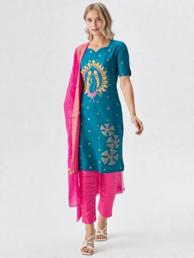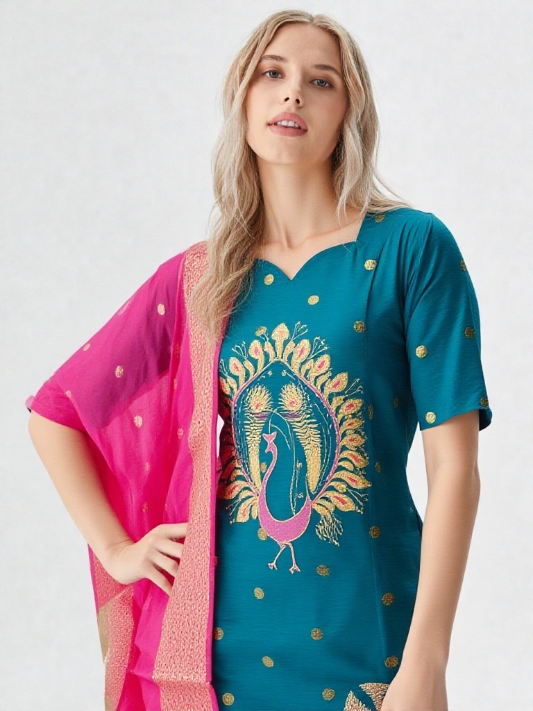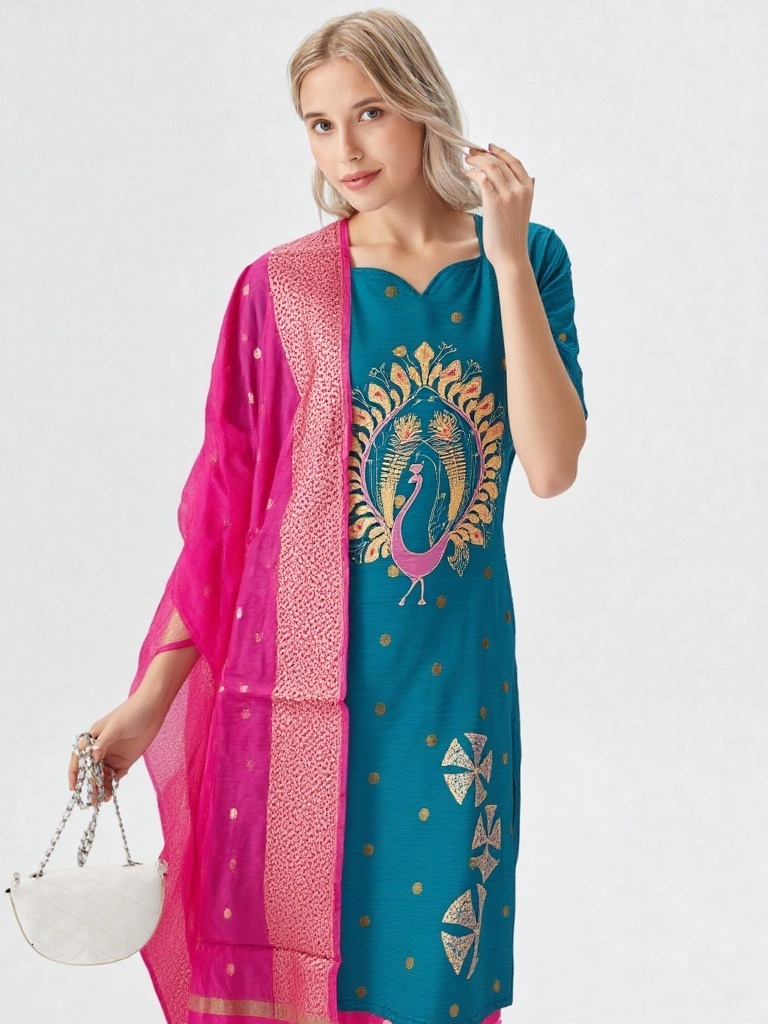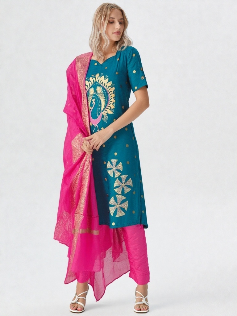 The highlight of this ensemble is the intricate handcrafted peacock motif , symbolizing beauty and pride. Gold-toned work and elegant detailing on the kurti add a regal touch. A scalloped neckline and Elbow Sleeves with slit give it a stylish, contemporary twist.