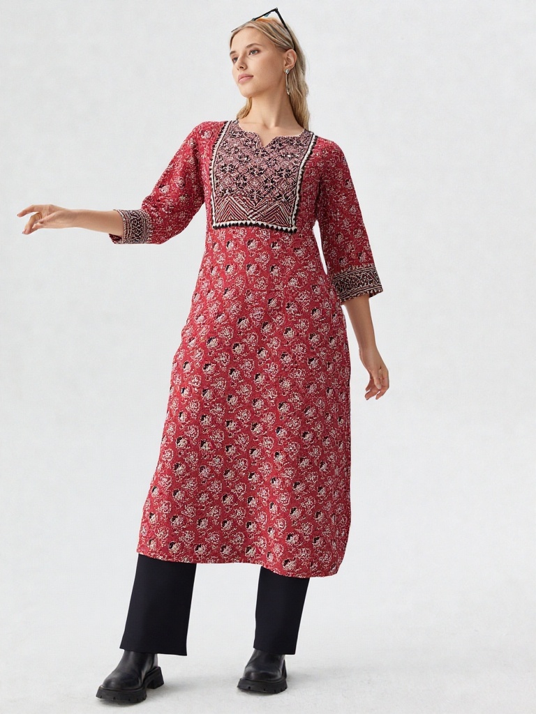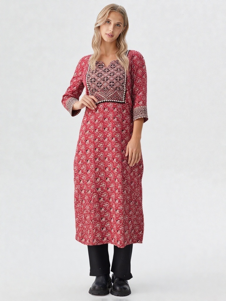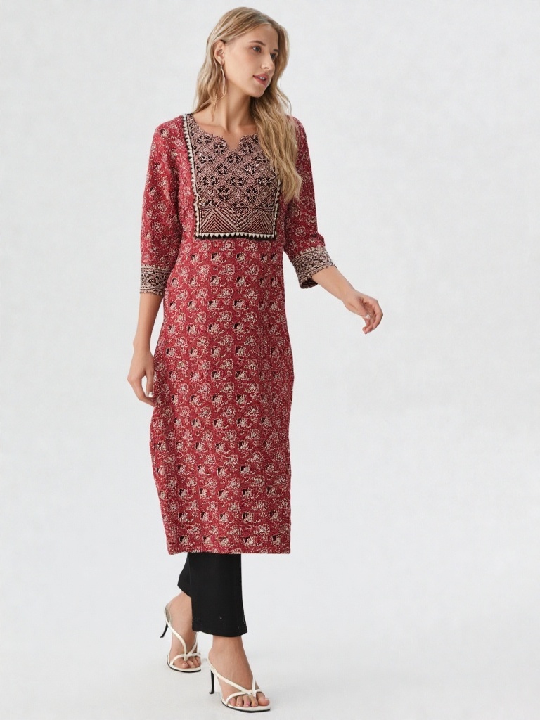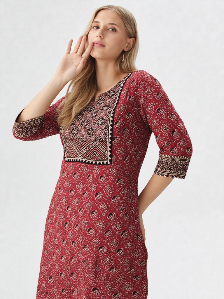 Elevate your everyday ethnic style with this beautifully crafted red Ajarakh kurti. Designed with intricate traditional motifs, this kurti features a detailed yoke pattern that adds a touch of elegance and authenticity. The soft, breathable fabric ensures all-day comfort, making it perfect for casual outings, workwear, or festive gatherings.