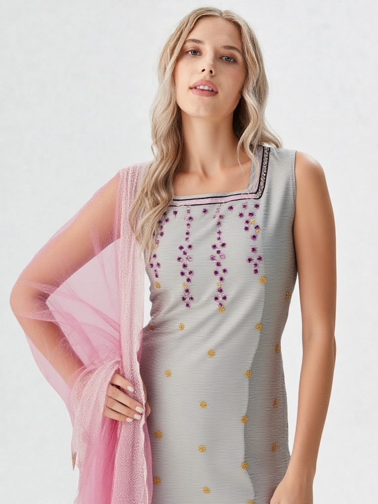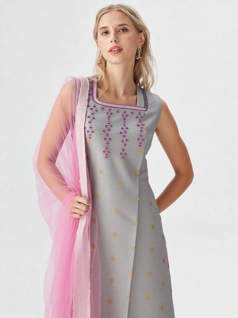 The kurti features delicate butti in golden and lilac floral Welbutti design , highlighting fine craftsmanship. Its asymmetric neckline and sleeveless silhouette add a touch of modernity. this ensemble is perfect for daytime celebrations, festive gatherings, or refined casual wear.