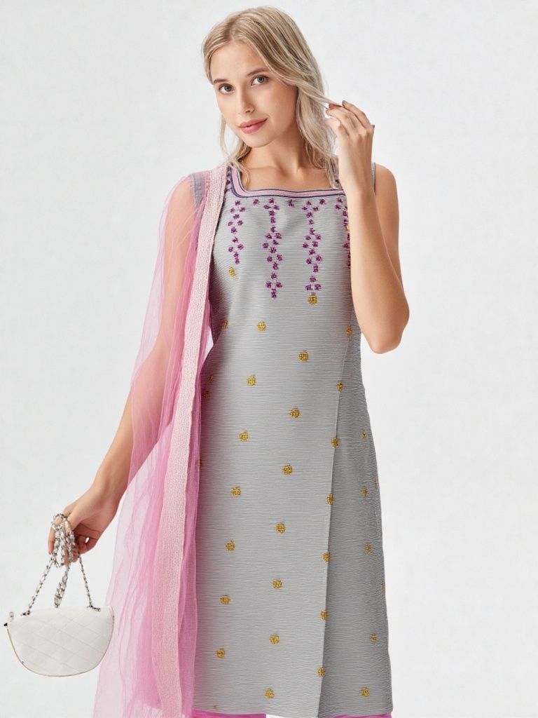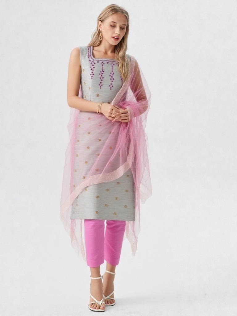 Understated yet graceful, this Welbutti Grey Cotton Silk Kurti beautifully balances simplicity with sophistication. Crafted from premium cotton silk, the fabric offers a smooth texture and gentle sheen that elevates its minimalist charm.