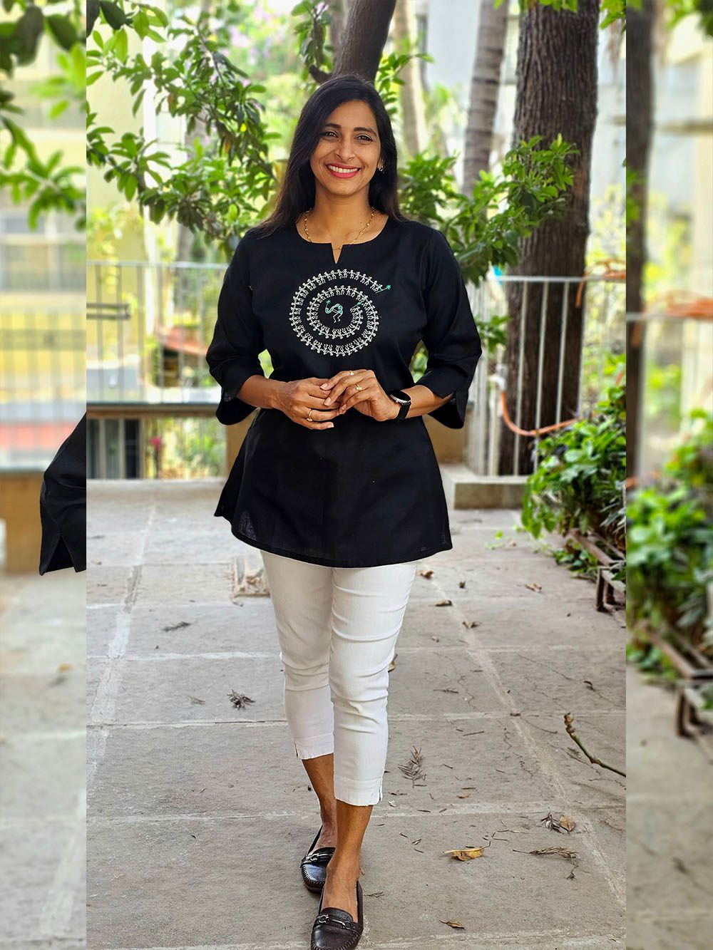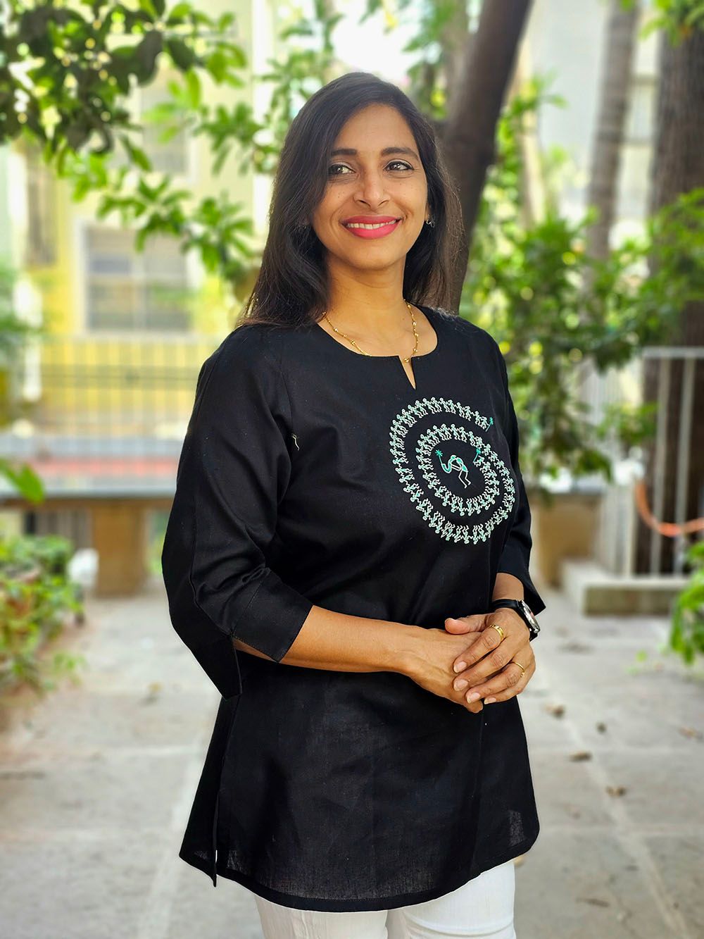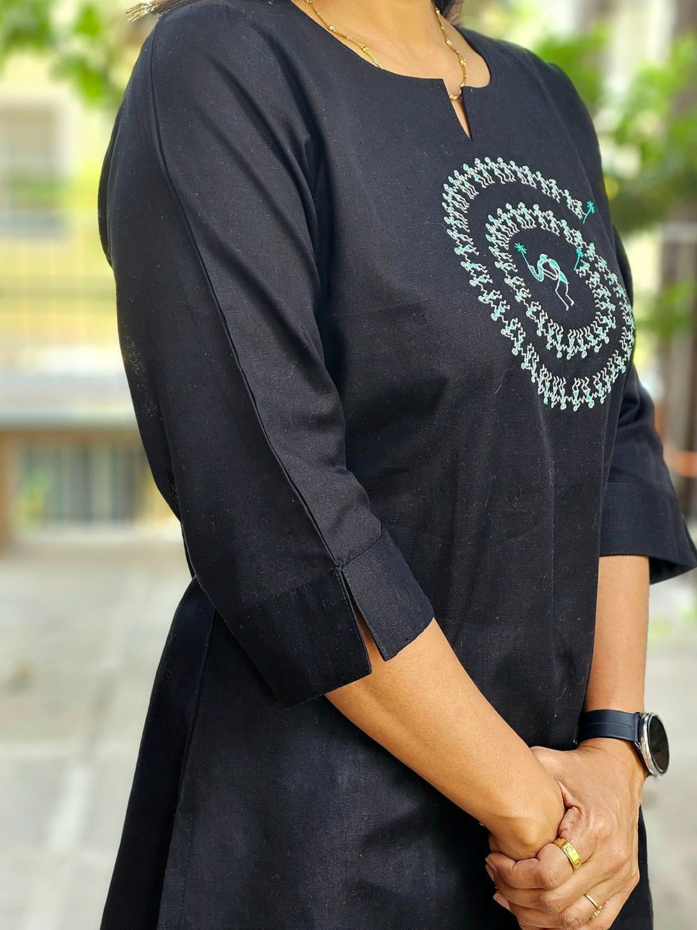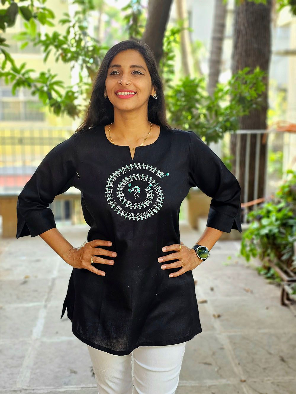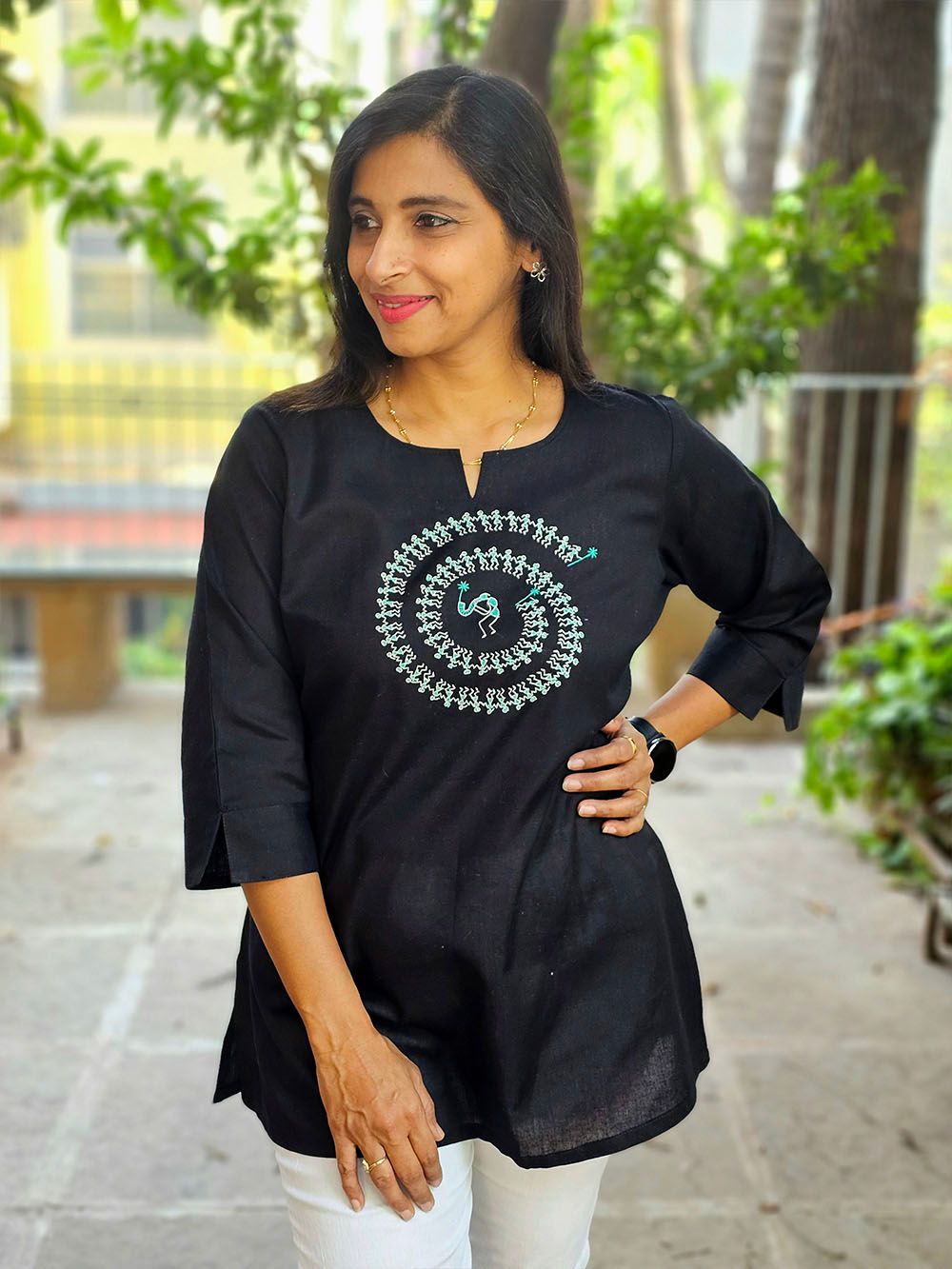 Crafted from a luxurious blend of cotton silk, this Aabandh tunic drapes effortlessly with a soft sheen and breathable comfort. Adorned with an intricate Warli Tarpa design — inspired by the ancient tribal art of Maharashtra — it captures the rhythmic celebration of life and nature through simple yet powerful motifs.